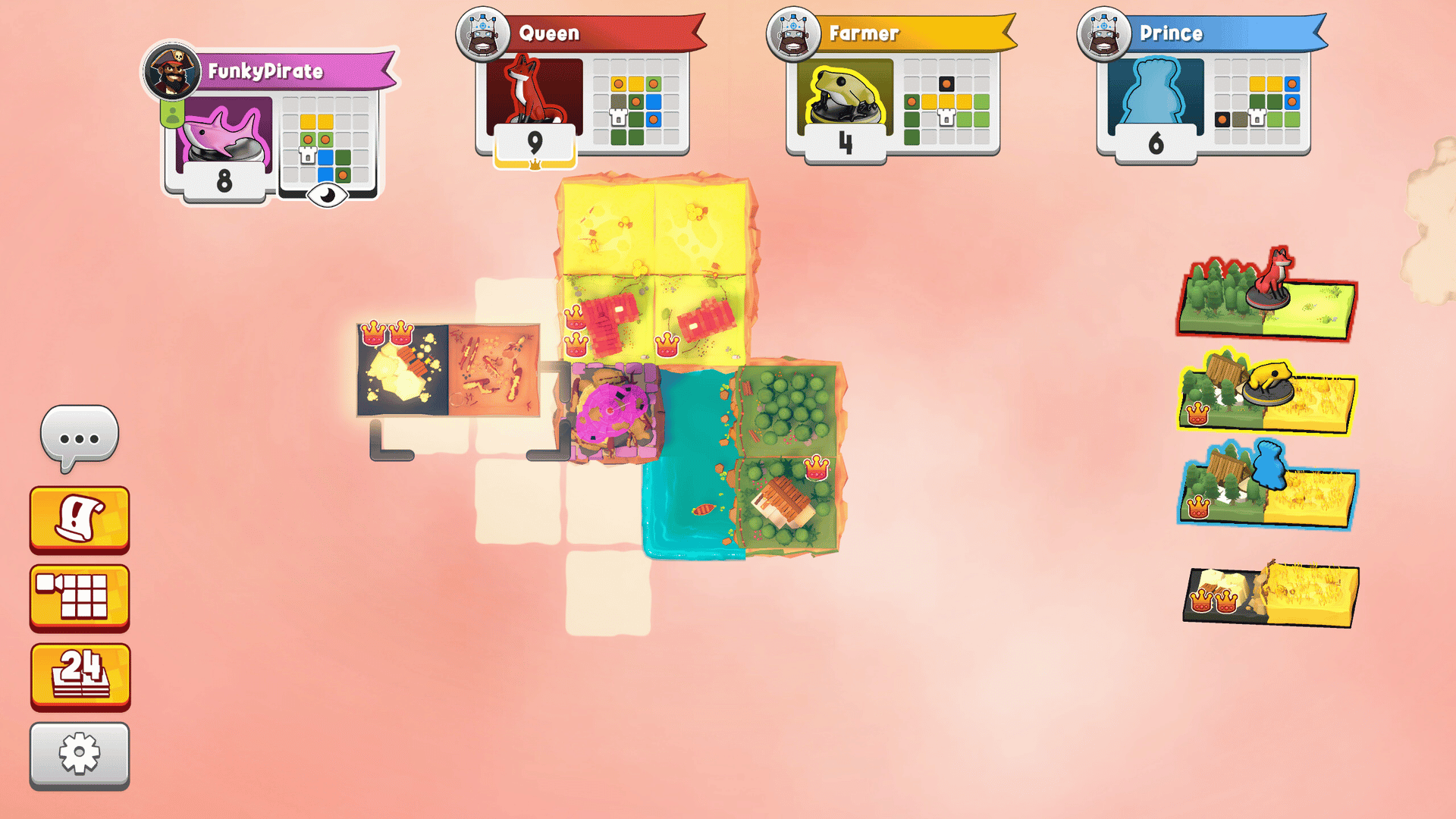 Kingdomino is a cosy 1-4 player tile-laying strategy game of kingdom building. Place colorful dominoes, match terrains, and crown your lands to create the most prosperous realm. Simple to learn yet deeply strategic game perfect for quick sessions, solo challenges, or competitive multiplayer.