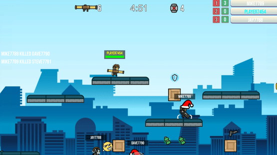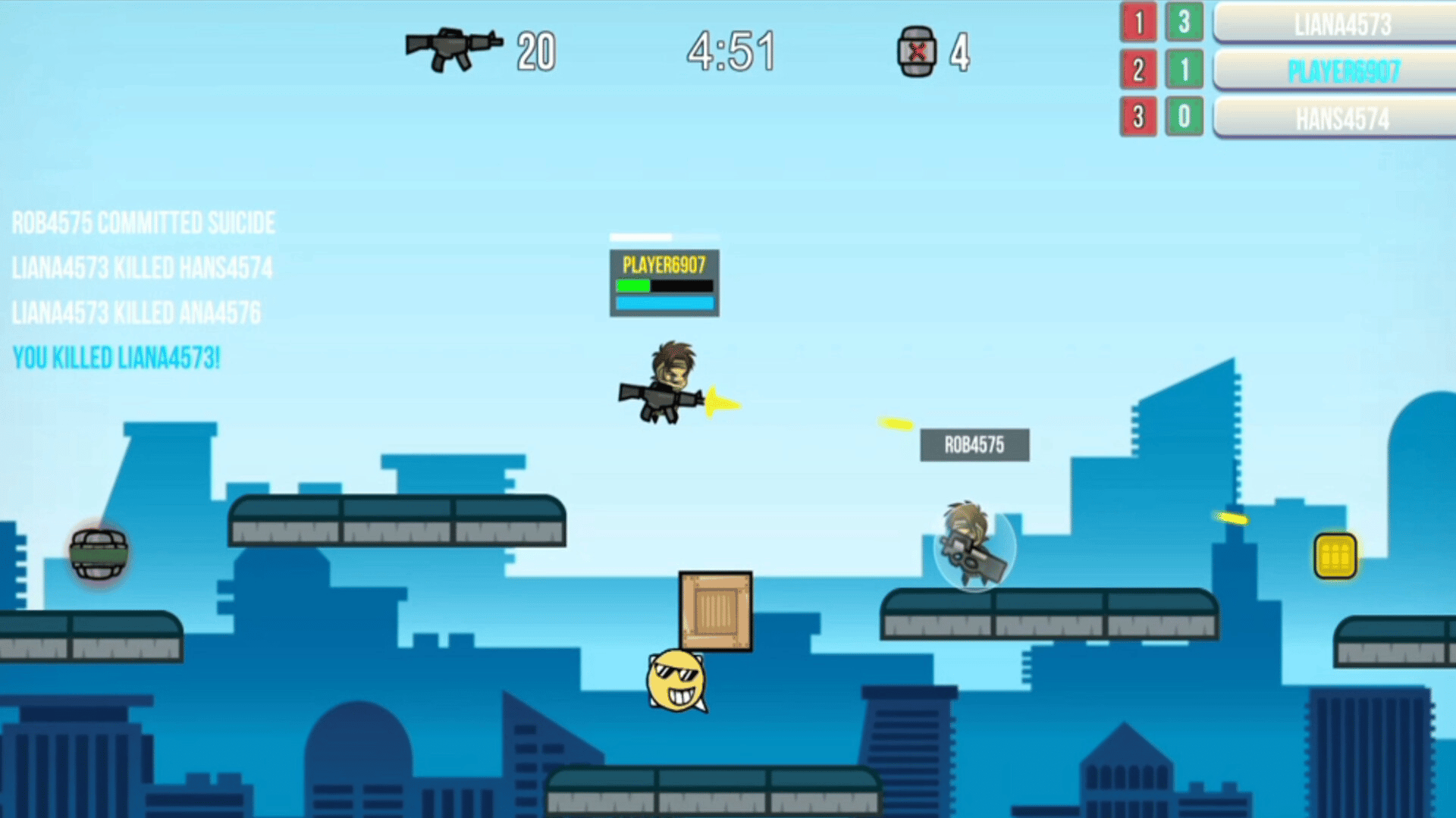 Engage in fast-paced 2D deathmatch action! Choose from 9 unique characters, collect weapons, grenades, and health packs as you battle for supremacy in a 5-minute showdown. Play against friends or bots in this thrilling shooter game where every kill counts!