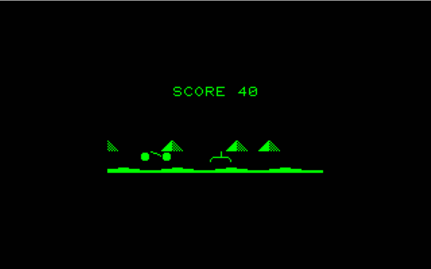 Buggy10 is influenced by the old arcade game "Moon Buggy" and is an attempt to fit something approaching this game into 10 lines of BASIC code. As your buggy moves along the parallax landscape, obstactles will randomly appear. Their speed can be unpredictable and they choose to appear semi-randomly based upon the MZ-80A's built in realtime clock. Shoot them as soon as you can because they will cause you to lose one of your 3 lives if you don't and they crash into you! The closer you are to the obstacle when you shoot it, the higher the score you'll receive.