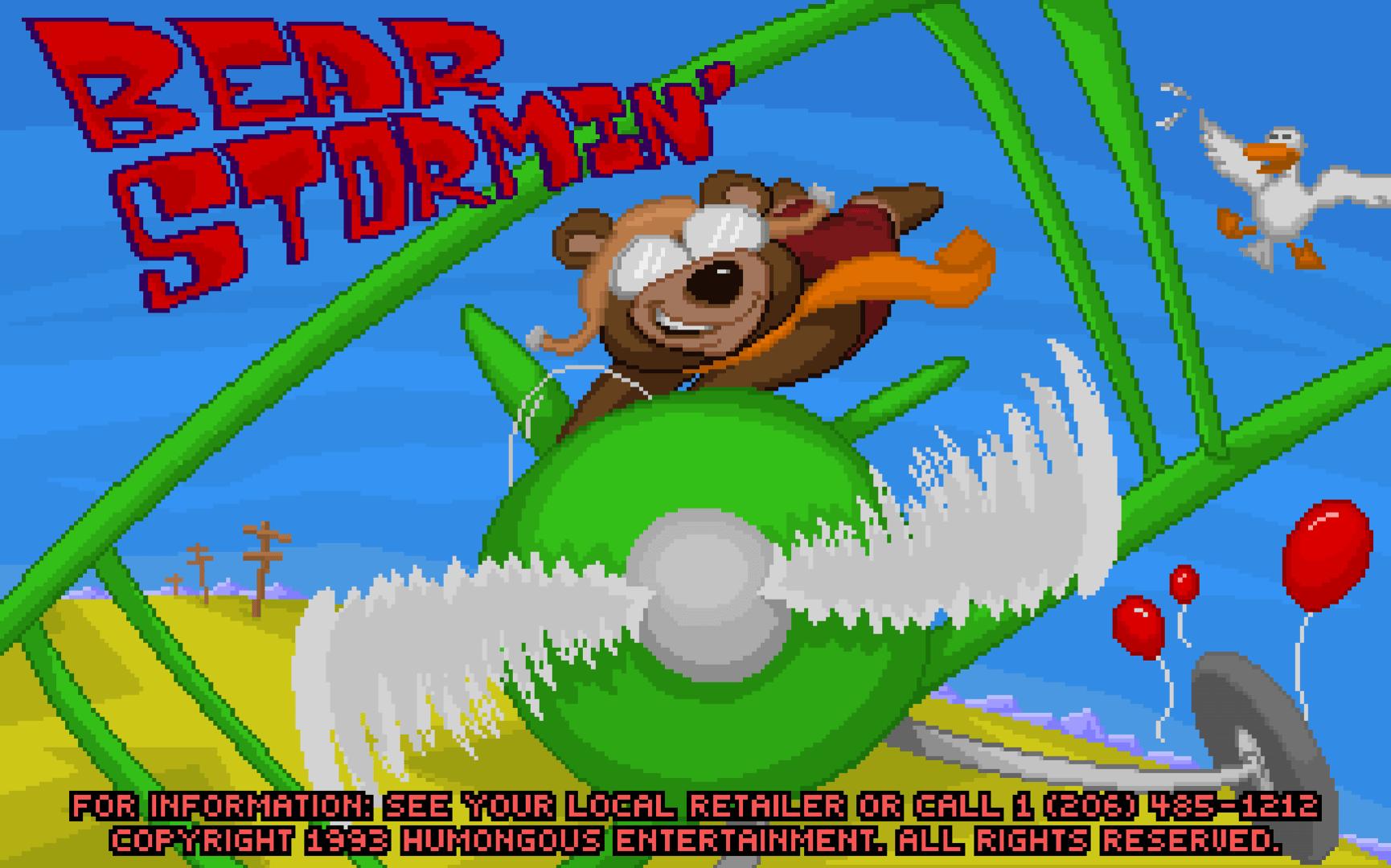You are the character Fatty Bear, flying an early 20th century biplane. The objective is to get to the finish line without losing a life.