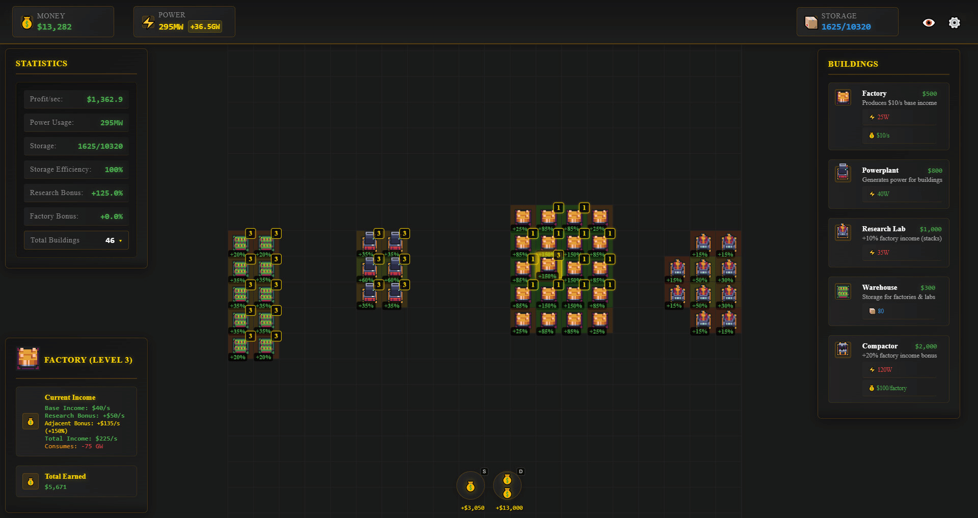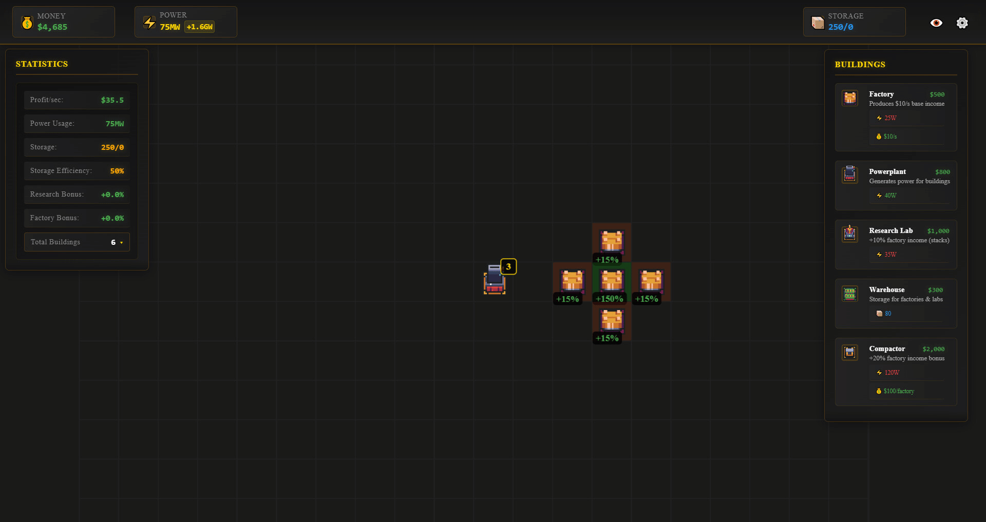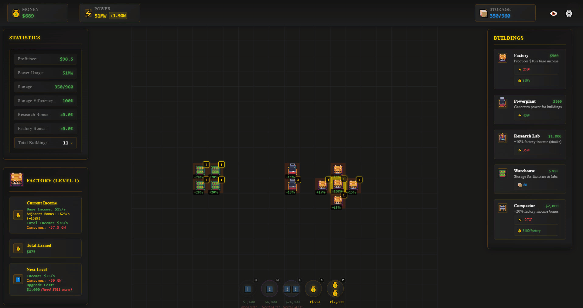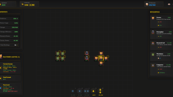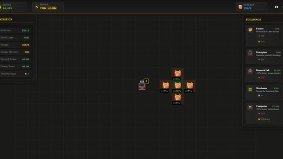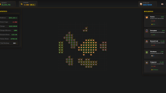 Build and optimize your industrial empire in this grid-based idle game. Place factories, power plants, and research labs strategically to maximize efficiency through adjacency bonuses. Upgrade your buildings, manage power consumption, and watch your profits soar while you're away.
