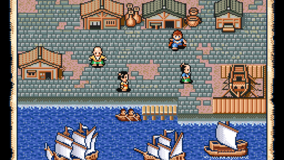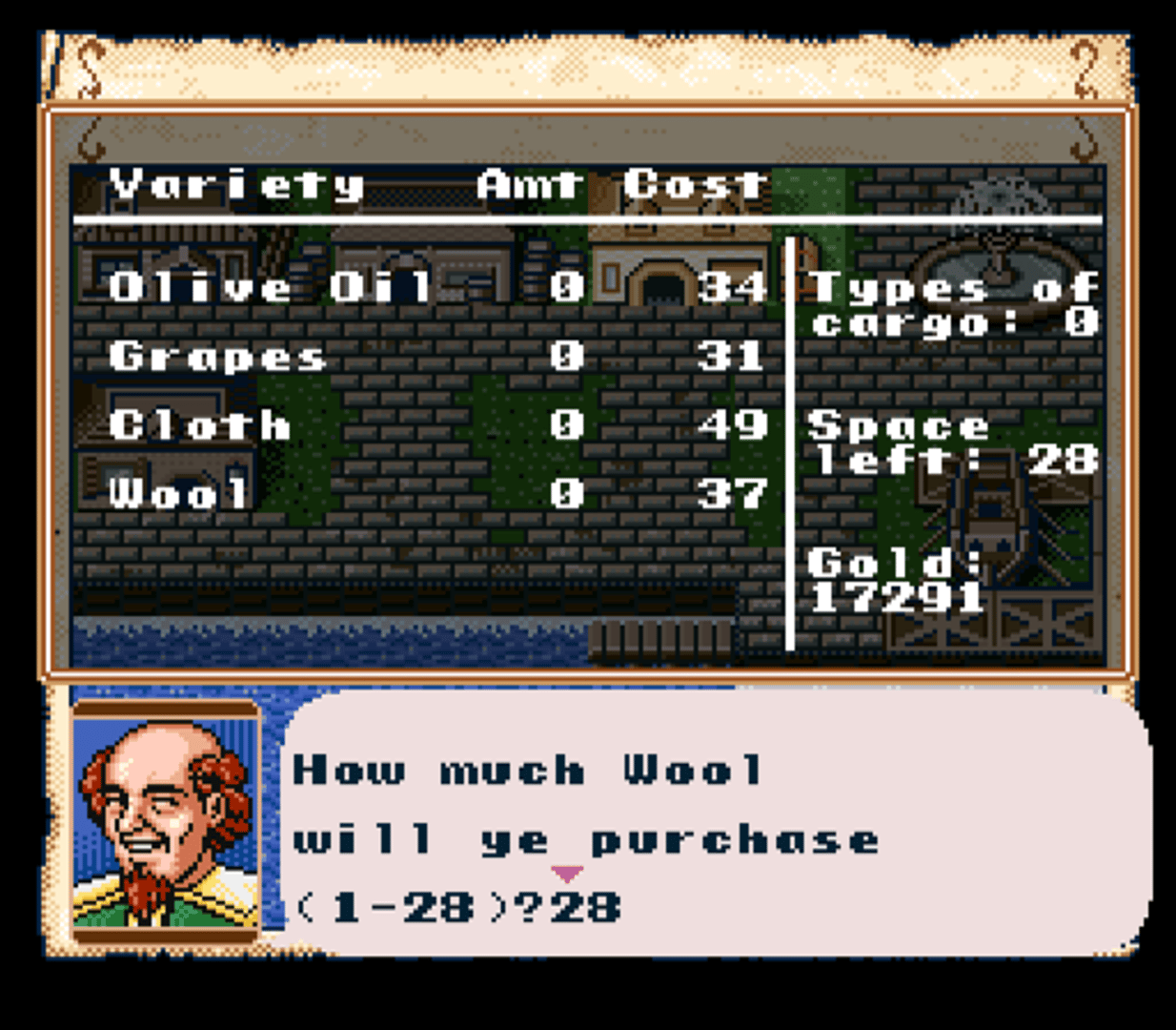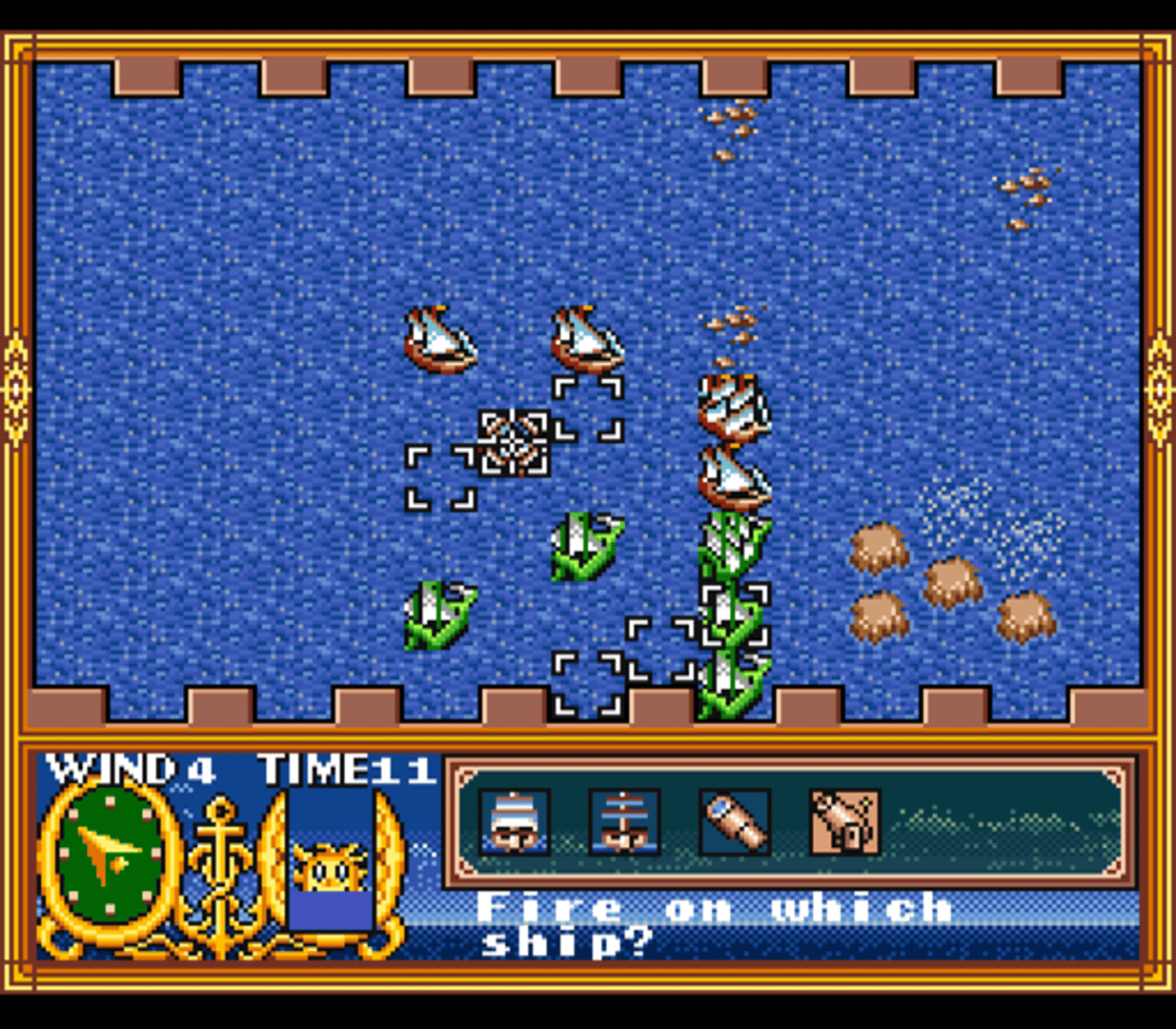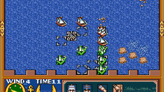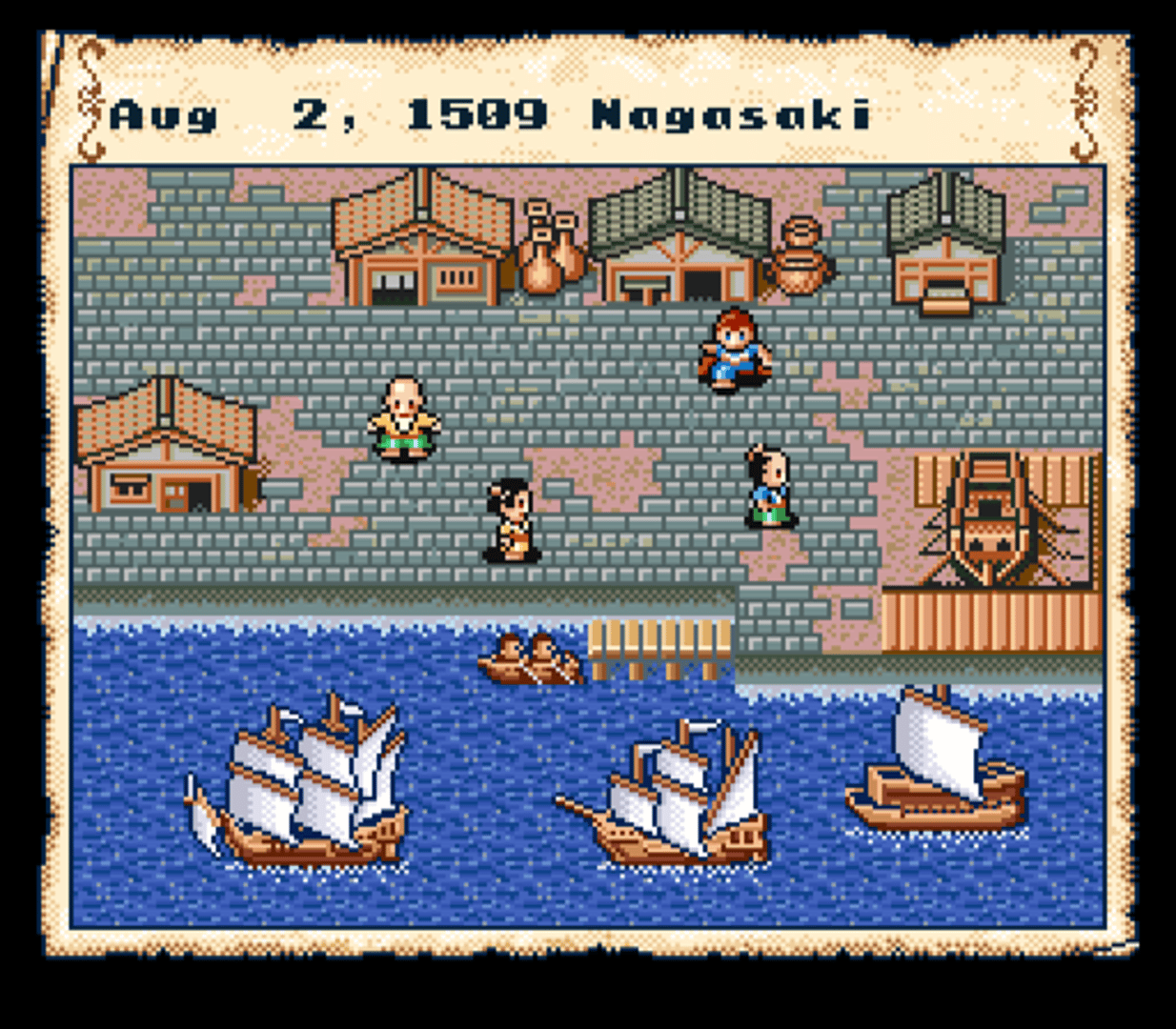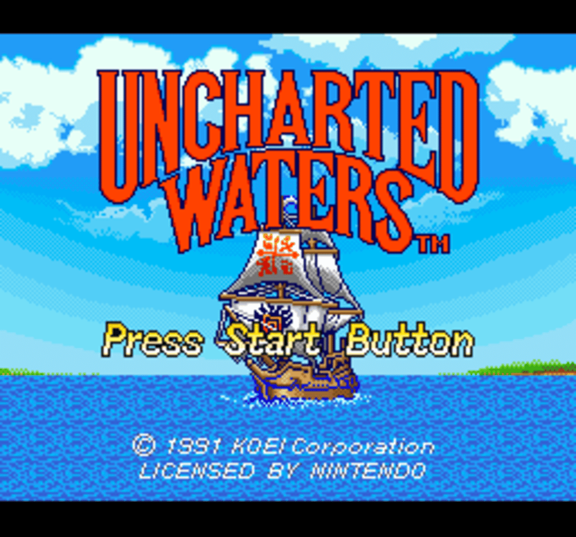 The SNES Port of "Uncharted Waters". (also known as Super Daikoukai Jidai in Japan) Climb aboard your flagship and set sail! As a young Portuguese captain, you are in search of fortune and fame. With your first mate at the helm, navigate the way to distant lands and legendary riches. Port ho! Cast anchor in a new land and barter with stubborn merchants for exotic-spices and gems. Use profits to improve your fleet or face the dangers of the sea - pirates, storms and the mysteries of the deep. Win allies for Portugal, and the King will reward you grandly!