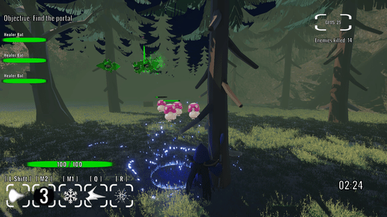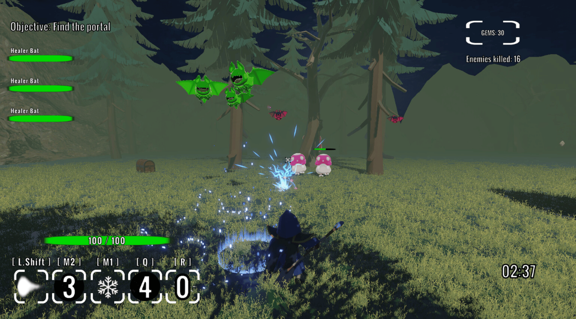 Roguelite wizard game, where you play as a wizard fighting off waves of monsters and bosses using powerful magic, gathering helper bats and perks. Each time you play, you'll face new challenges in different biomes, making you think on your feet and try different strategies to win.