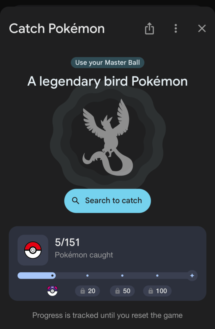 A game on Google Search in which the player collects Pokémon by searching for their names. A hint about a random Pokémon is also given, and Master Balls are unlocked under certain conditions for the Legendaries and Mythical ones. Only the first generation of Pokémon is available (the first 151).