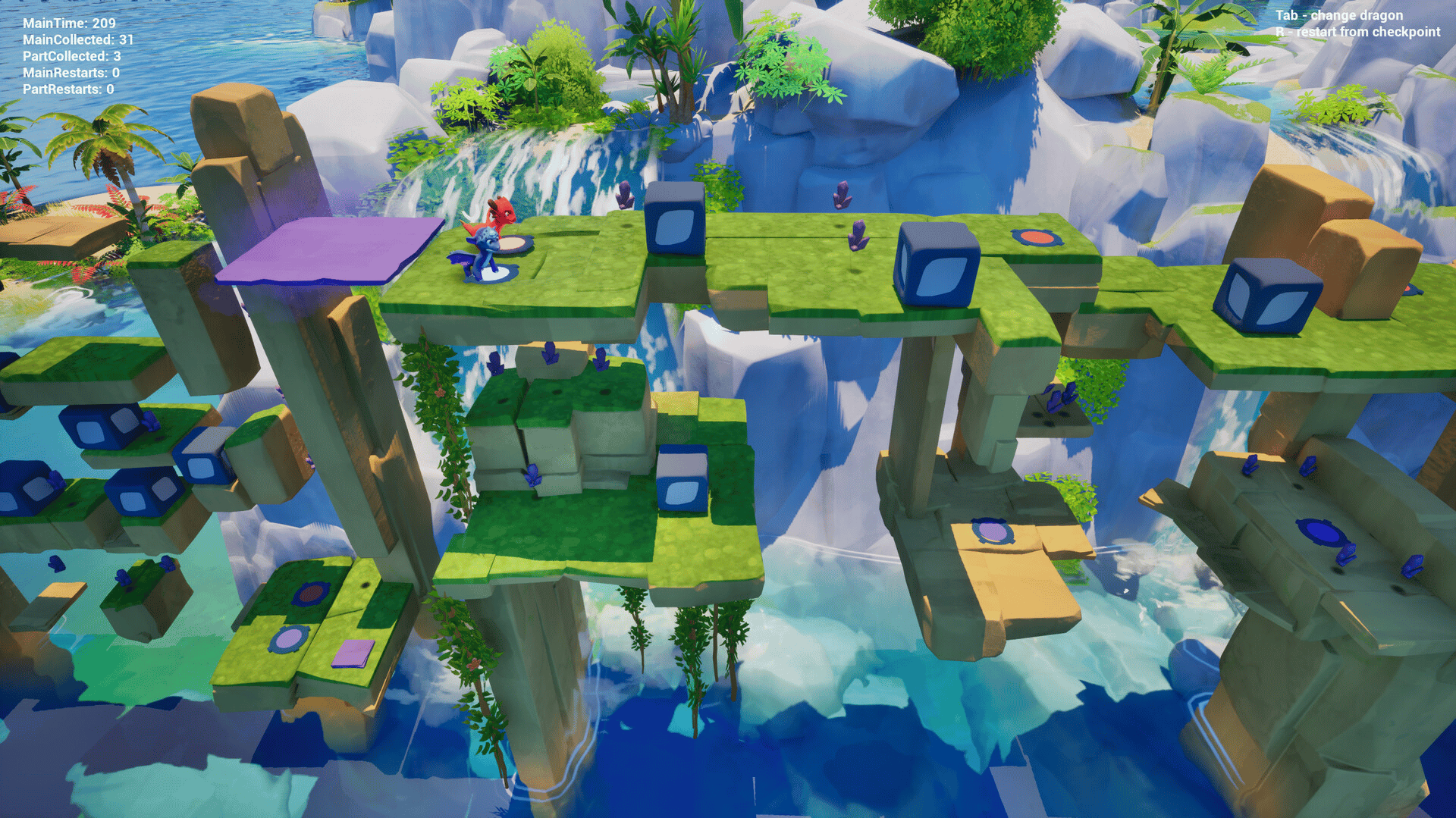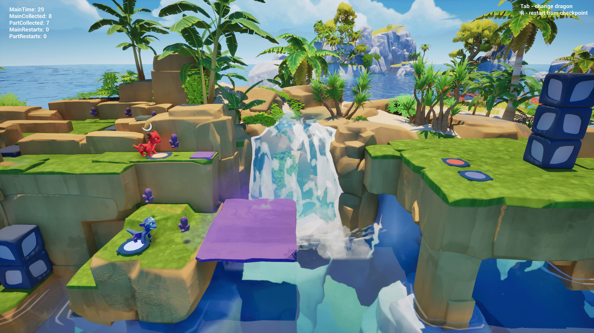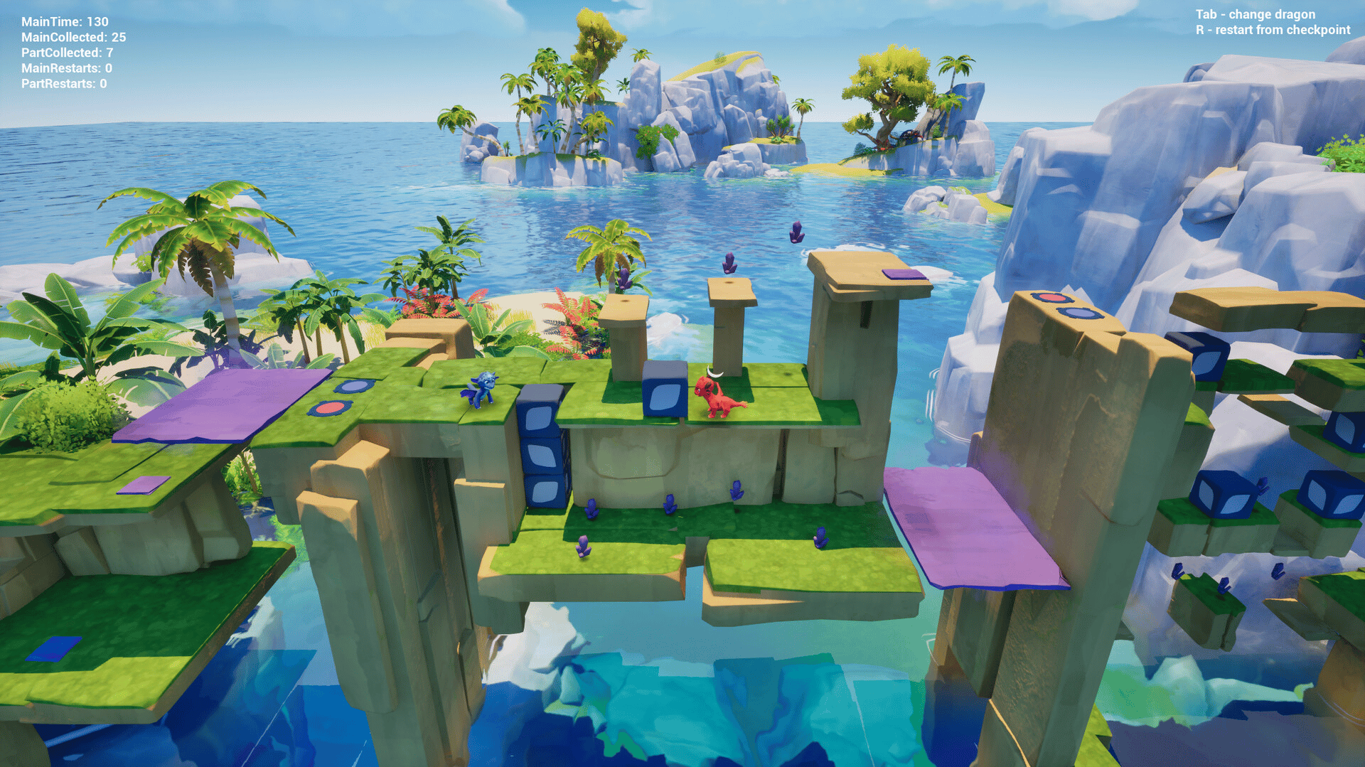 A platformer-puzzle game You play as two dragons with different abilities. One dragon can jump, and the other can push magical stones.