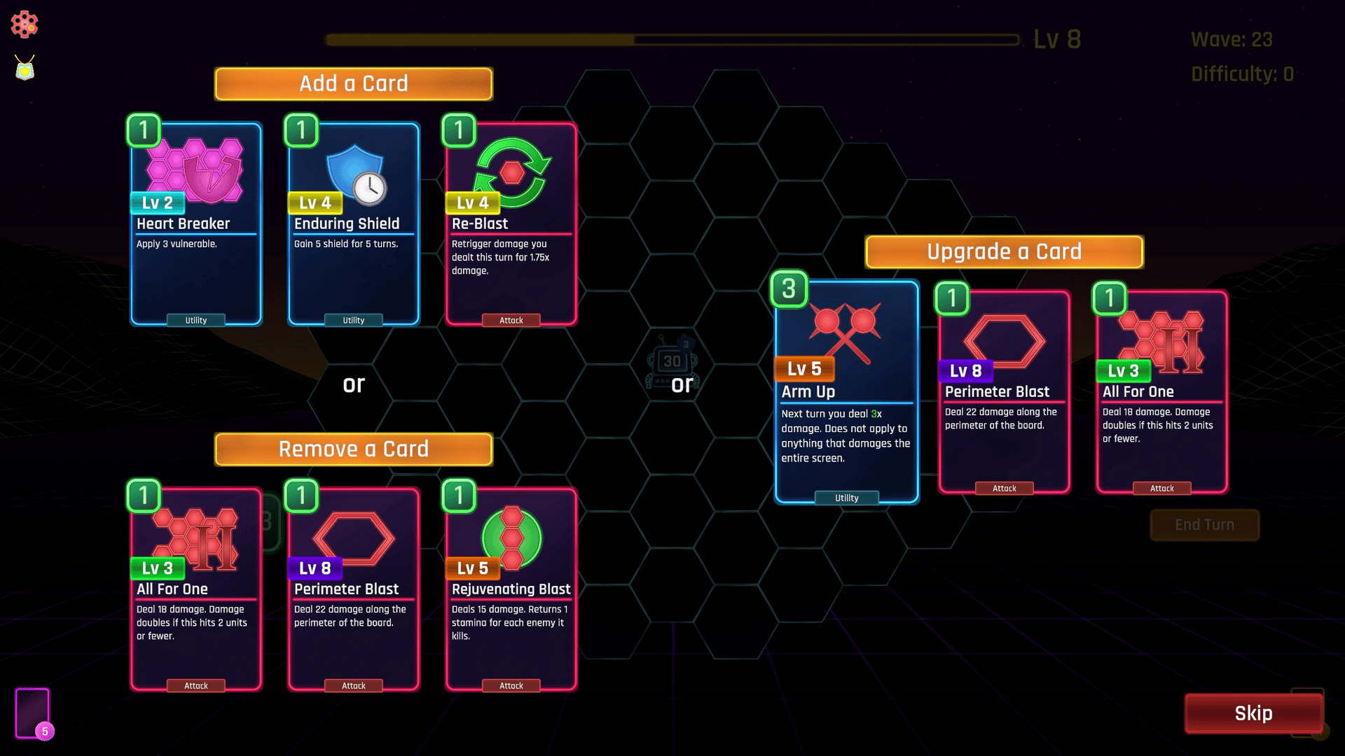 Hex Blast is a horde survival x roguelike deckbuilder where you strategize on a hex grid, chaining explosive card combos to wipe out cyber hordes. Build your deck, collect overclocked chips, and discover the most broken builds to annihilate cyber threats—before they overwhelm you.