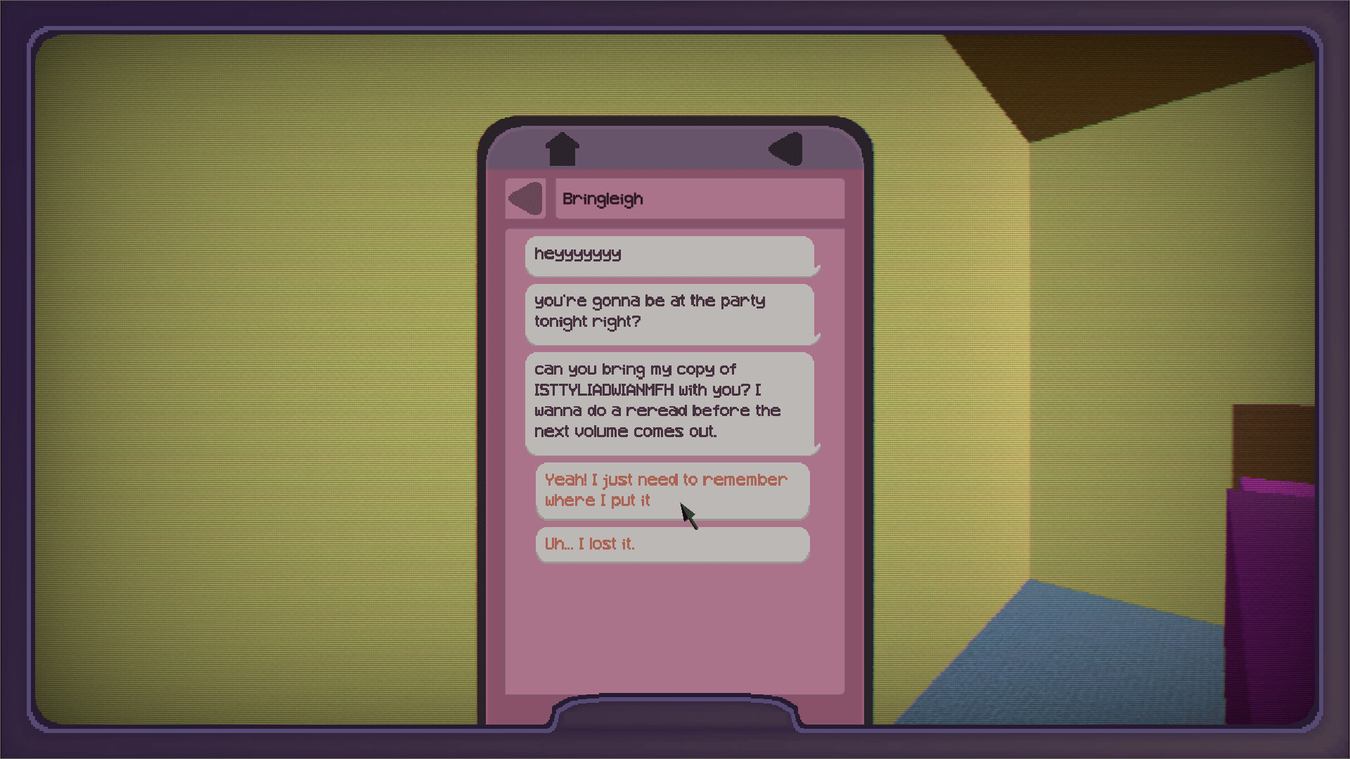 A quickplay and replayable first-person point-and-click adventure with a low-poly 3D retro style about getting ready for a party, featuring branching story paths with multiple in-game characters, 100+ items to discover and collect, and many interactions and events.