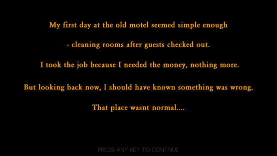 Jacob White, a young man in need, took a job at an old motel. It seemed easy: clean rooms, survive the nights. But he soon noticed increasingly unsettling things. Adding to his pain was the recent loss of his wife.