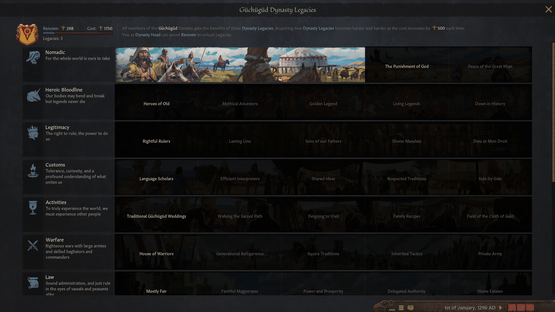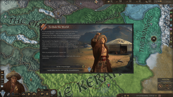 The winds sweep across the Great Steppe as you look over your people, preparing to ride toward the horizon in search of greener pastures, lands to conquer, and new treasures to claim. In Khans of the Steppe, the second Core Expansion for Crusader Kings III, the nomadic life takes center stage, offering a rich tapestry of new challenges and opportunities. Become — or defeat — the Great Khan as you harness the unique powers of the nomads, navigate the ever-changing Steppe Seasons, and bend the world to your will.