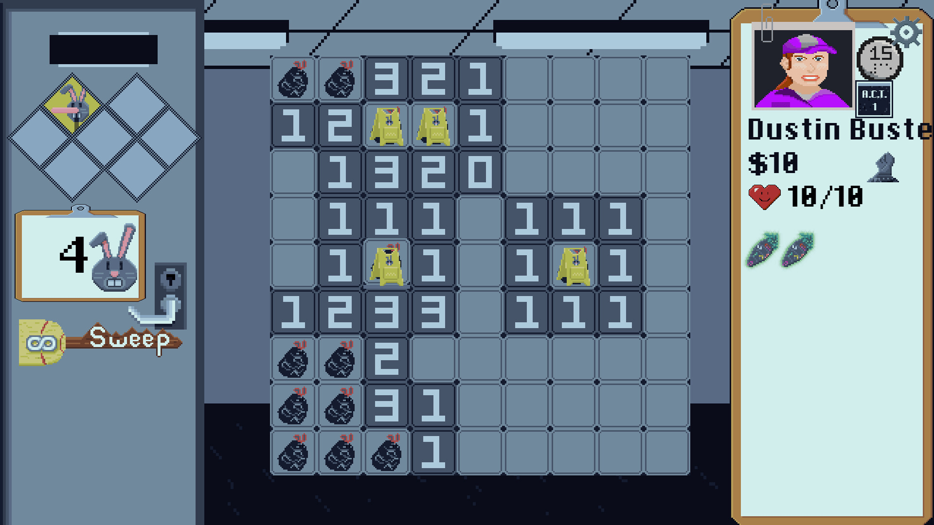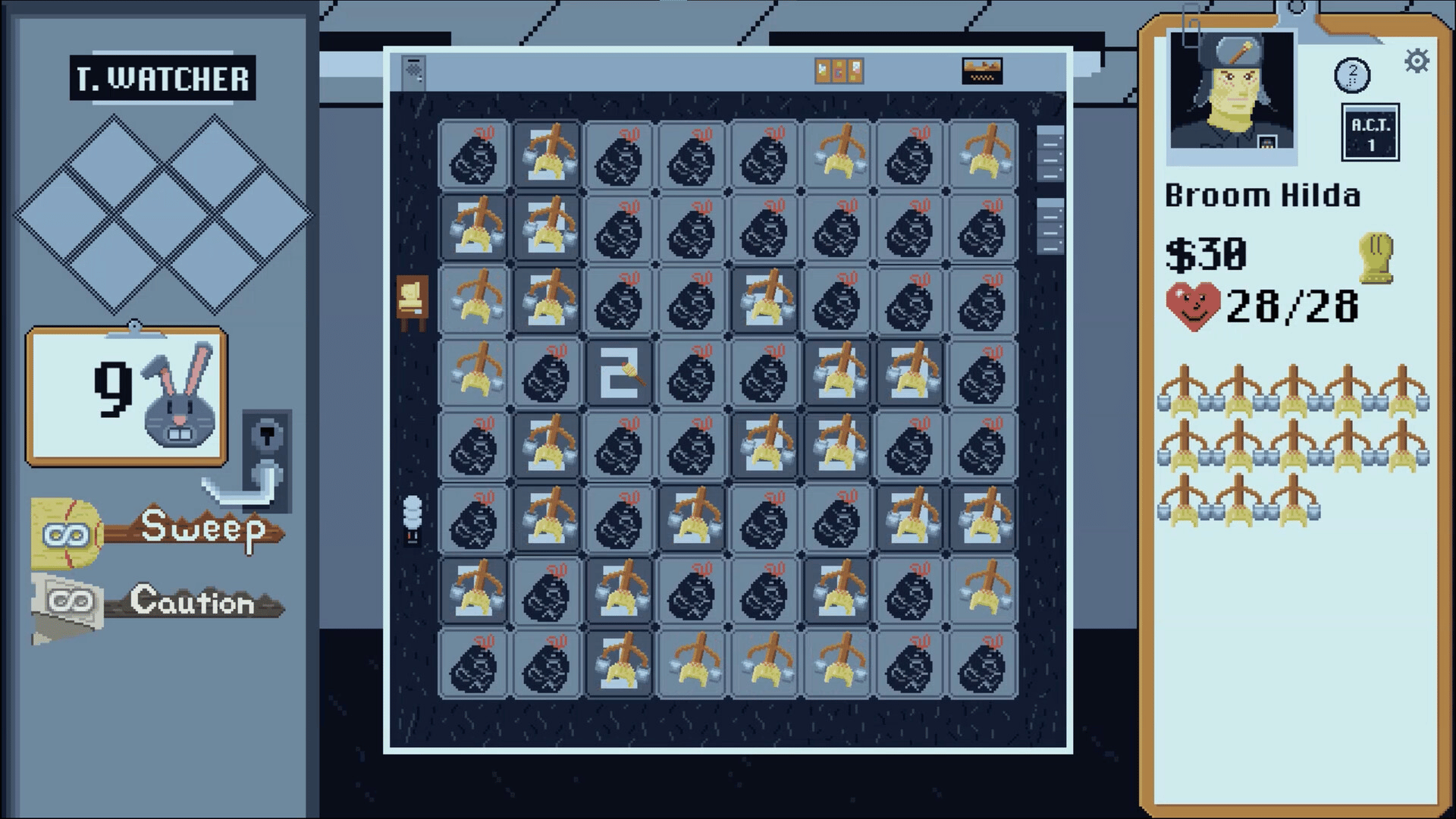 BroomSweeper is a Minesweeper-style Roguelike puzzle game. Unmask the evil lurking at TentaTech, Inc. as you ascend through increasingly challenging floors. Assemble winning combinations from over 100 powerful items to defeat the dust bunnies and keep your job until morning!