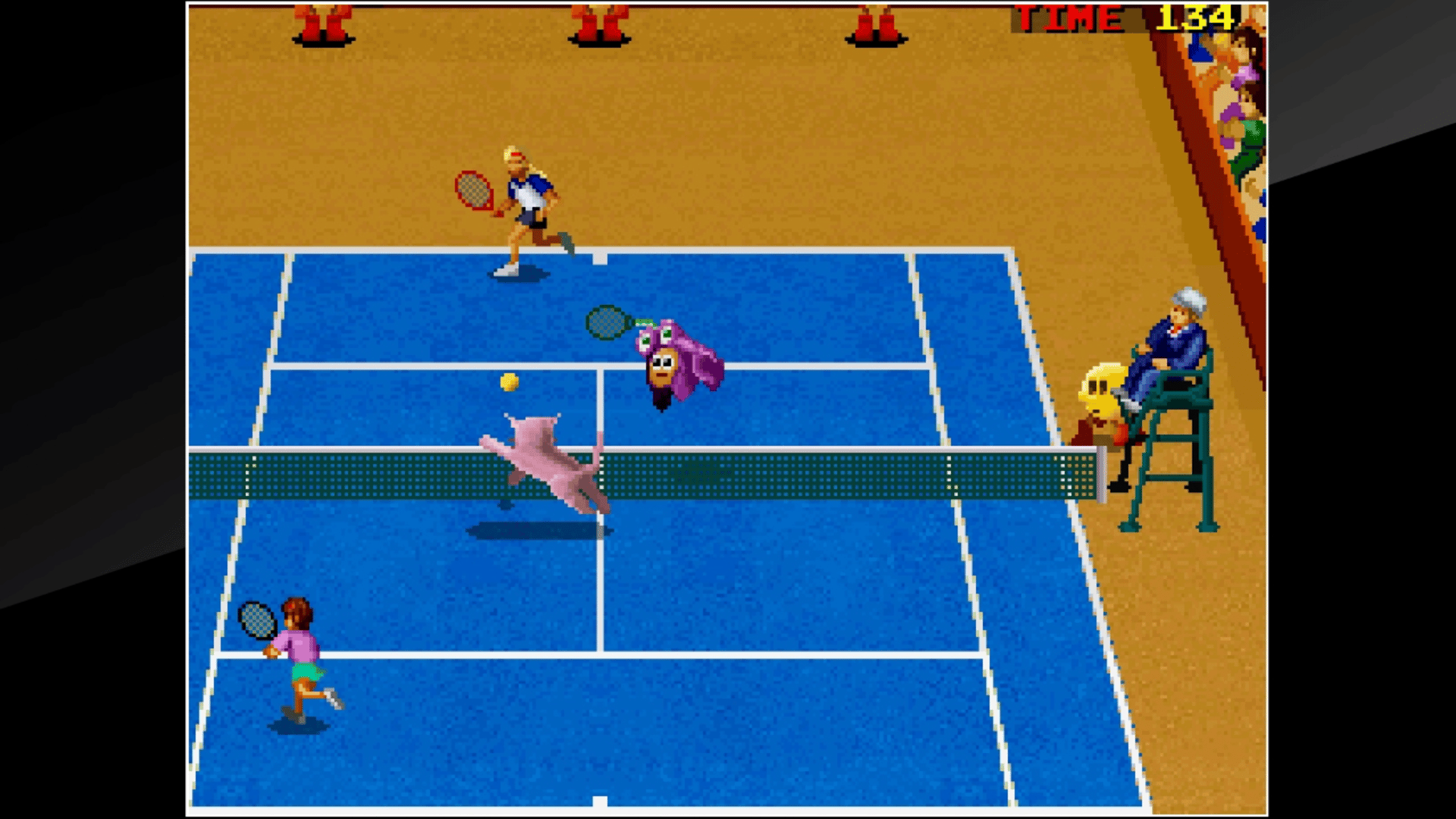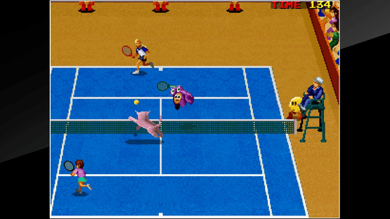"SUPER WORLD COURT" is a sports game released by NAMCO (Bandai Namco Entertainment) in 1993. It is the sequence to "PRO TENNIS WORLD COURT" and adds support for 4-player simultaneous games. Featuring a roster of numerous distinctive players with their own specialties, this is your chance to pick your favorite and win your way through tournaments!