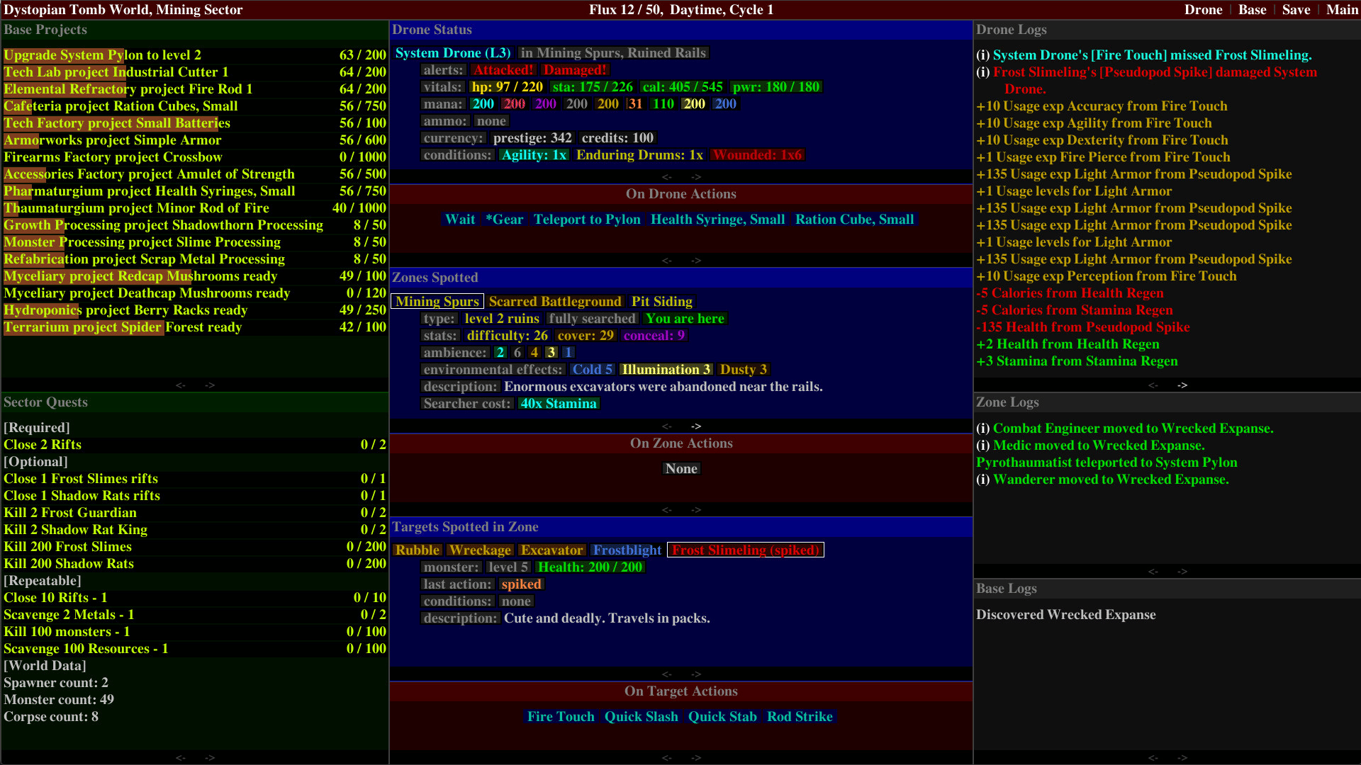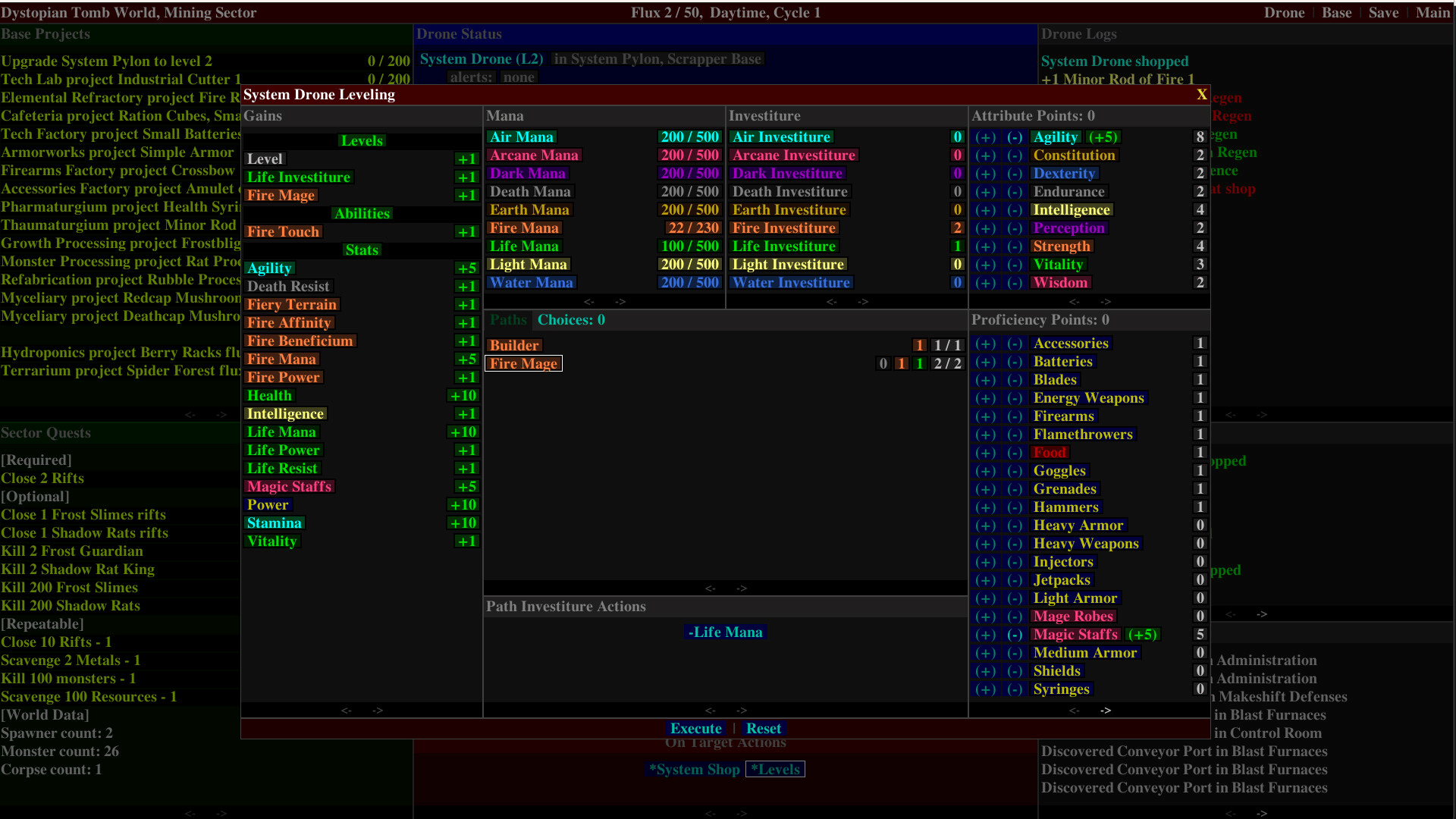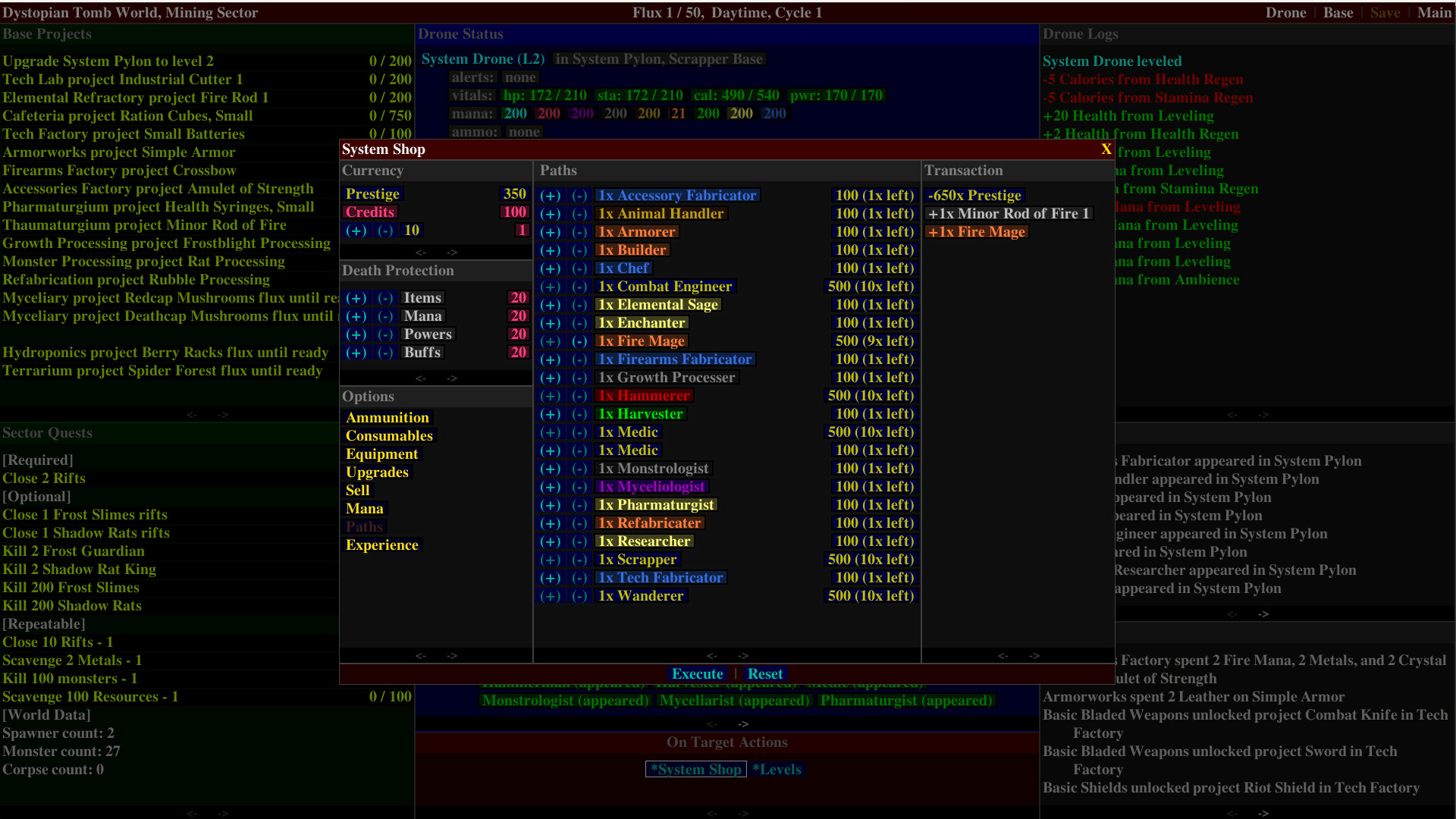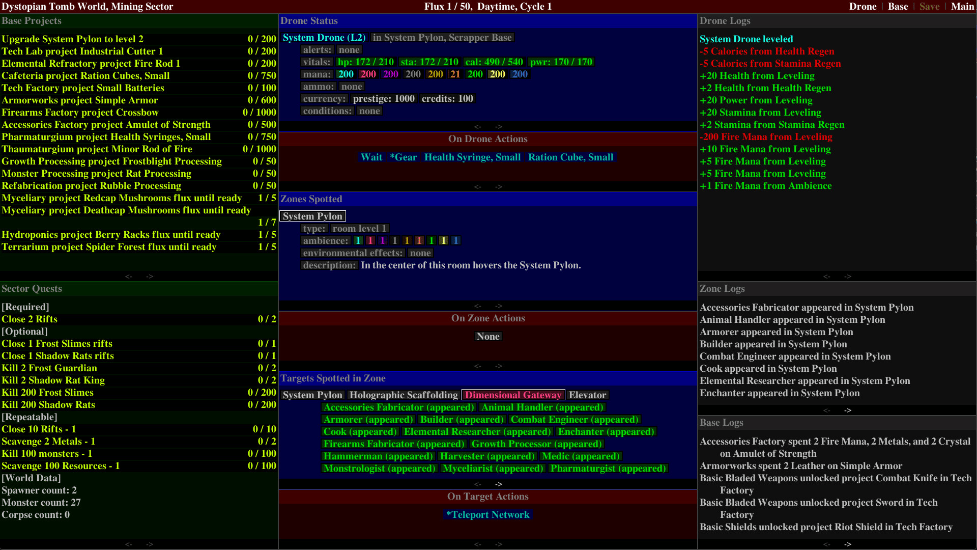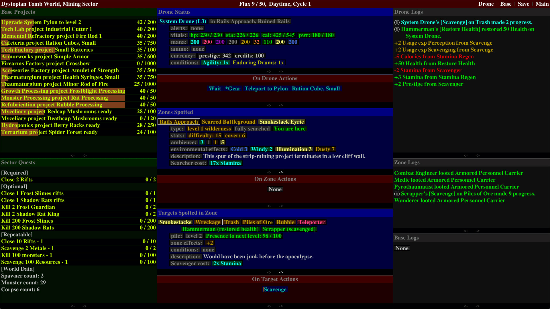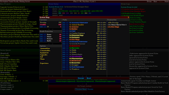 A magitech, post-apocalyptic, turn-based RPG. Assist your faction with exploration, resource gathering, construction, research, item fabrication, and monster extermination, while absorbing ambient mana and leveling up your System drone.