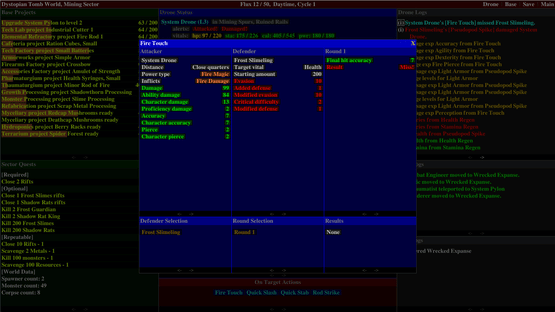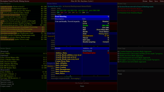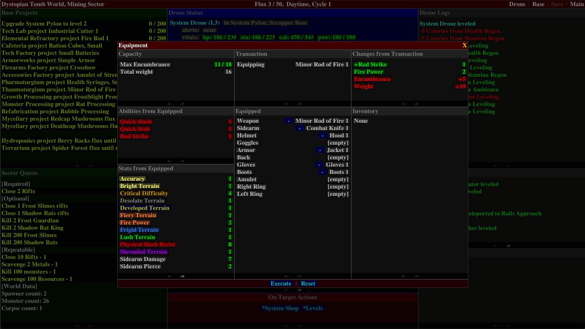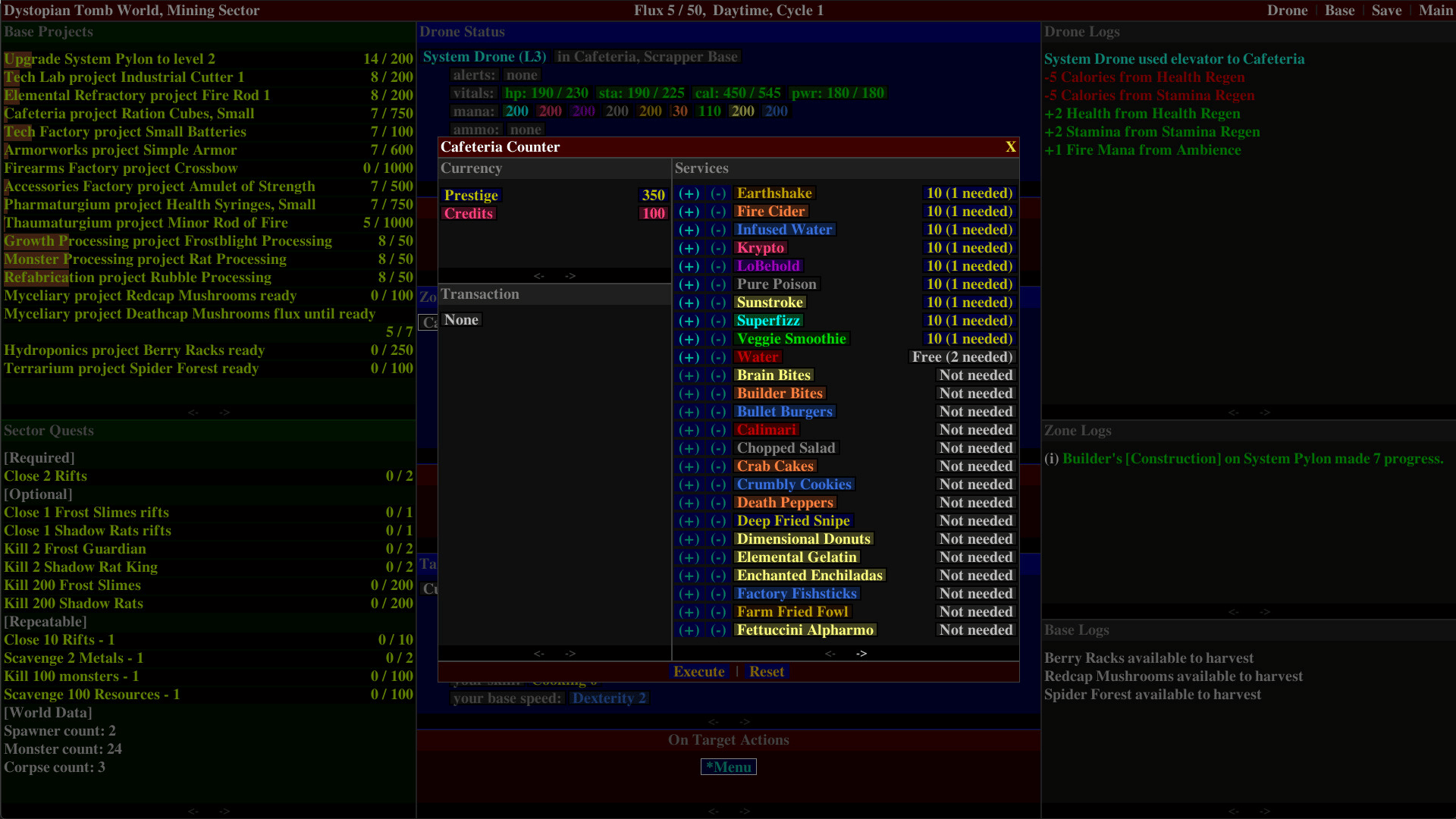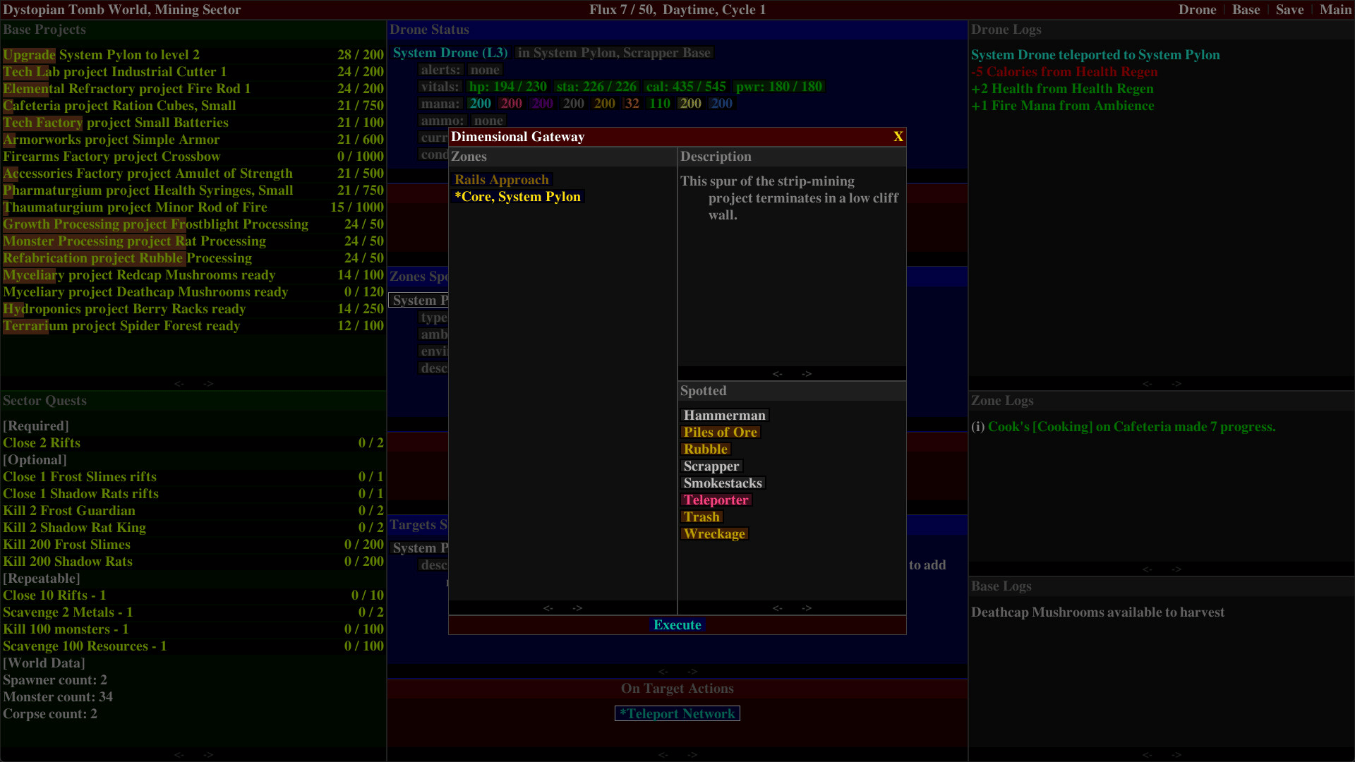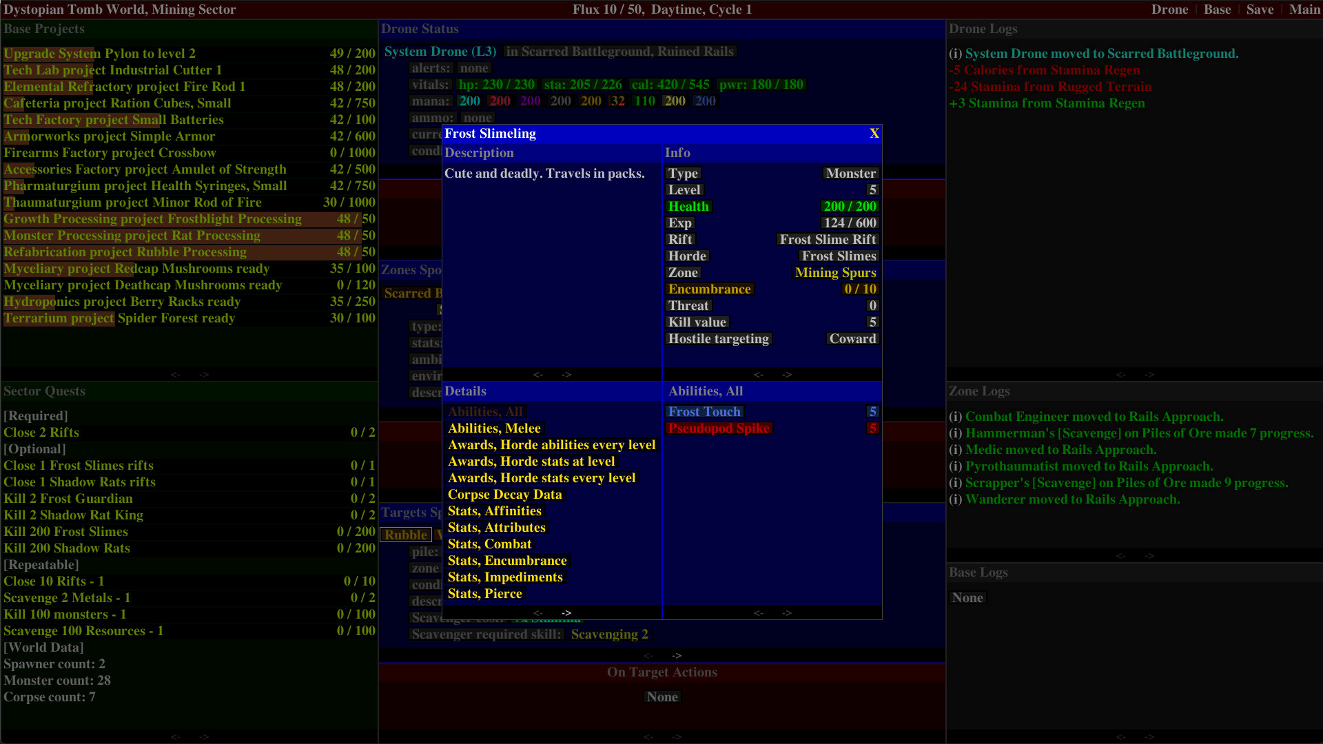 A magitech, post-apocalyptic, turn-based RPG. Assist your faction with exploration, resource gathering, construction, research, item fabrication, and monster extermination, while absorbing ambient mana and leveling up your System drone.