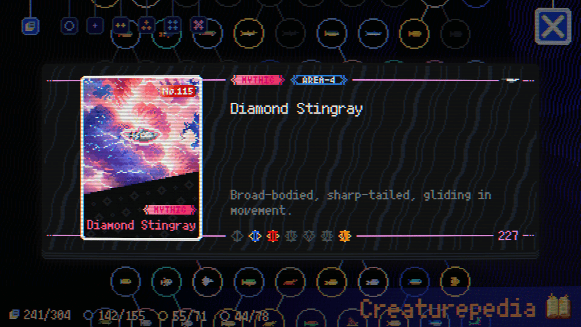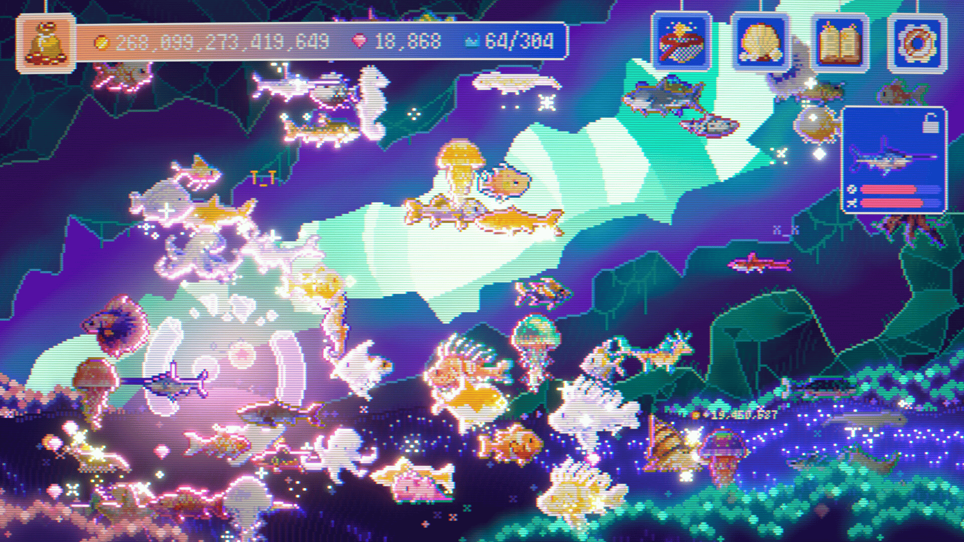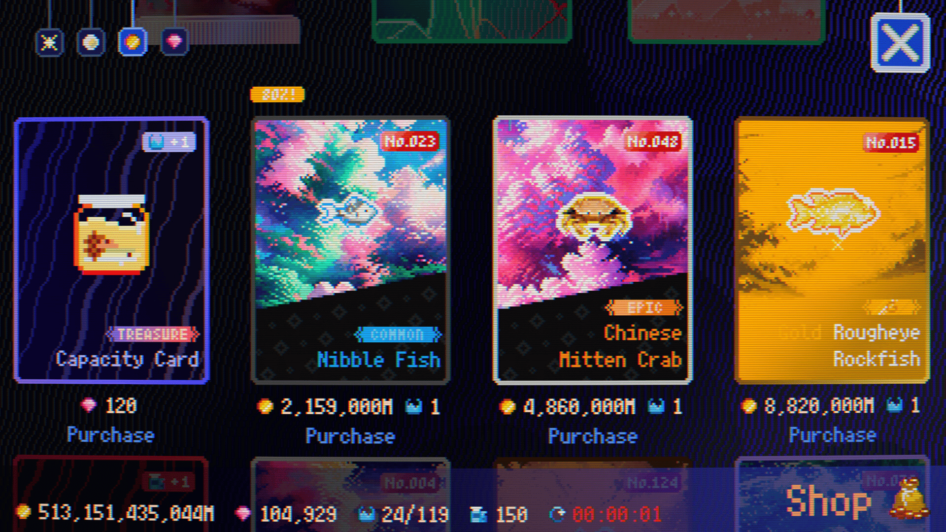FISHTOPIA is a pixel art style casual game blending idle gameplay with card collection. Discover 12 card types with special effects, featuring 300+ unique creatures and 100+ decorative items. Mix and match vibrant themes to craft your cyberpunk aquatic world.