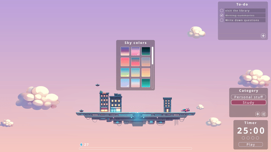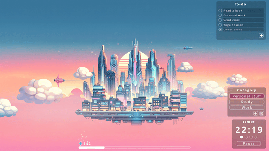Sky Dreamer blends sci-fi adventure with relaxed productivity. Use a customizable Pomodoro timer and to-do lists to stay on task as floating cities grow and futuristic landscapes inspire you. Discover soothing sounds and dynamic challenges to keep you focused and motivated!