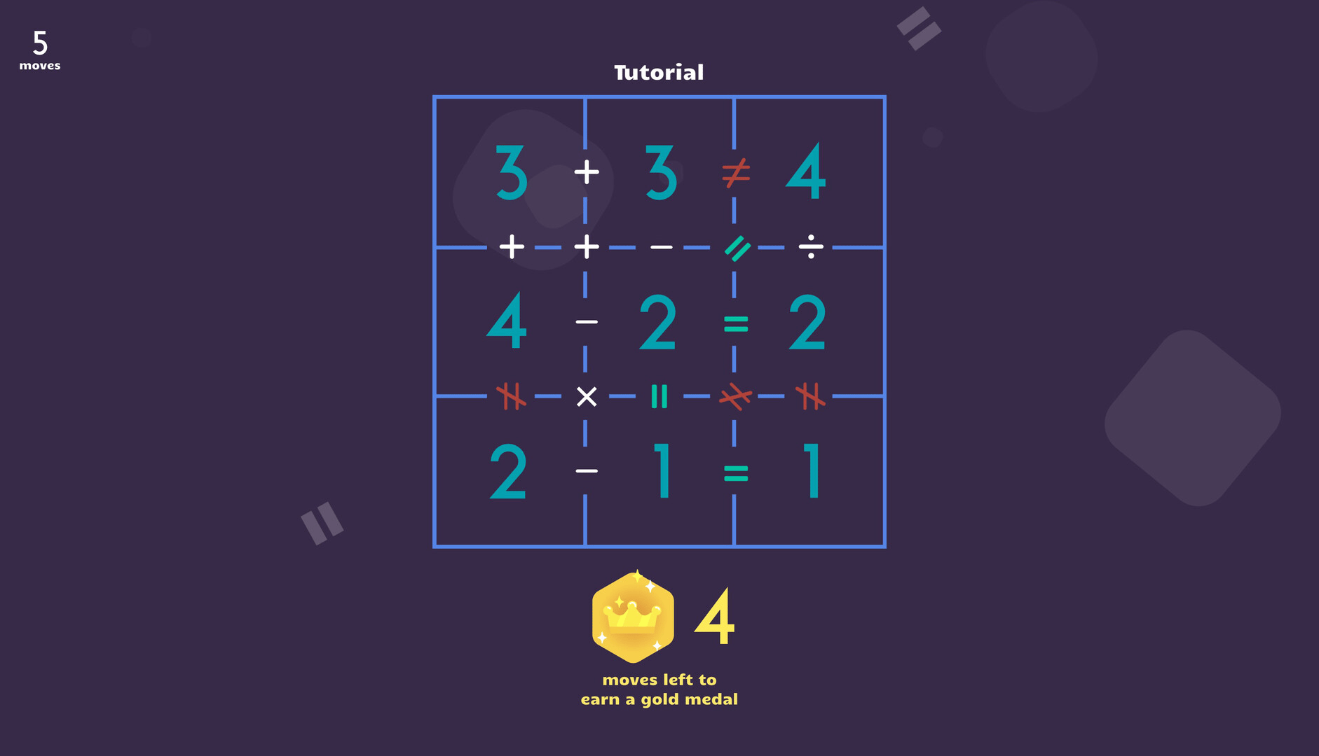 Equate 8 is an innovative and addicting new math puzzle game by the creator of The Devil's Calculator. Rearrange numbers in a 3x3 grid to solve eight equations (3 across, 3 down, and 2 diagonal) in the fewest moves possible. Challenges involve a variety of operators and difficulty levels!
