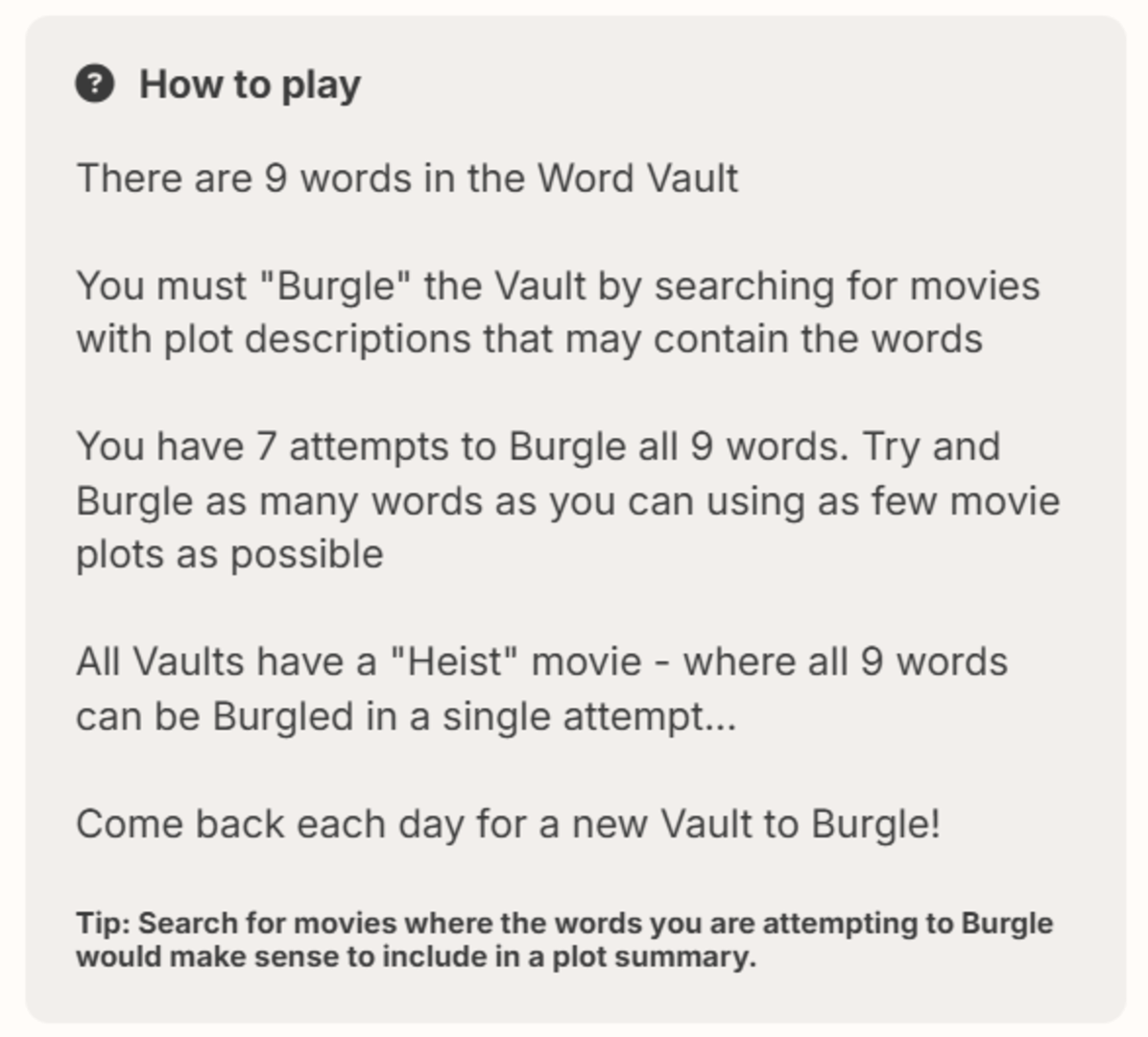 There are nine words in the "Word Vault". Players have seven attempts to "burgle" the vault by searching for movies with plot descriptions that may contain the words. All word vaults have a "heist" movie, where all 9 words can be burgled in a single attempt.
