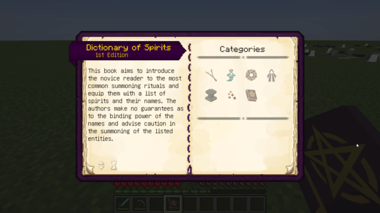 A ritual magic system centered around summonable spirits allows you to automate various tasks, store vast amounts of items, let demons mine in void dimensions, create powerful enchanted tools and jewelry, get support from familiars, and much much more. Begin your journey by crafting the Dictionary of Spirits, and following that in-game guide, discover the secrets of the spirit world, find otherworld groves hidden in plain sight by gaining the "Third Eye", and finally summon your first spirit.