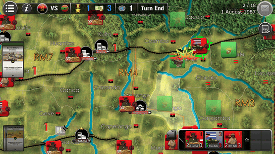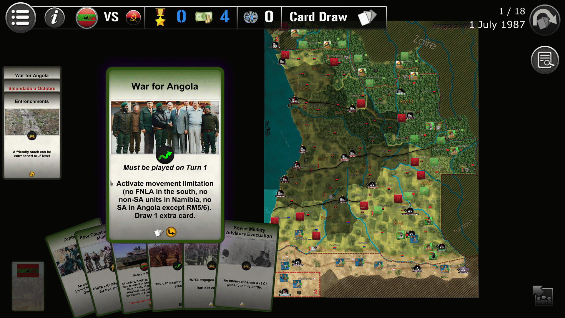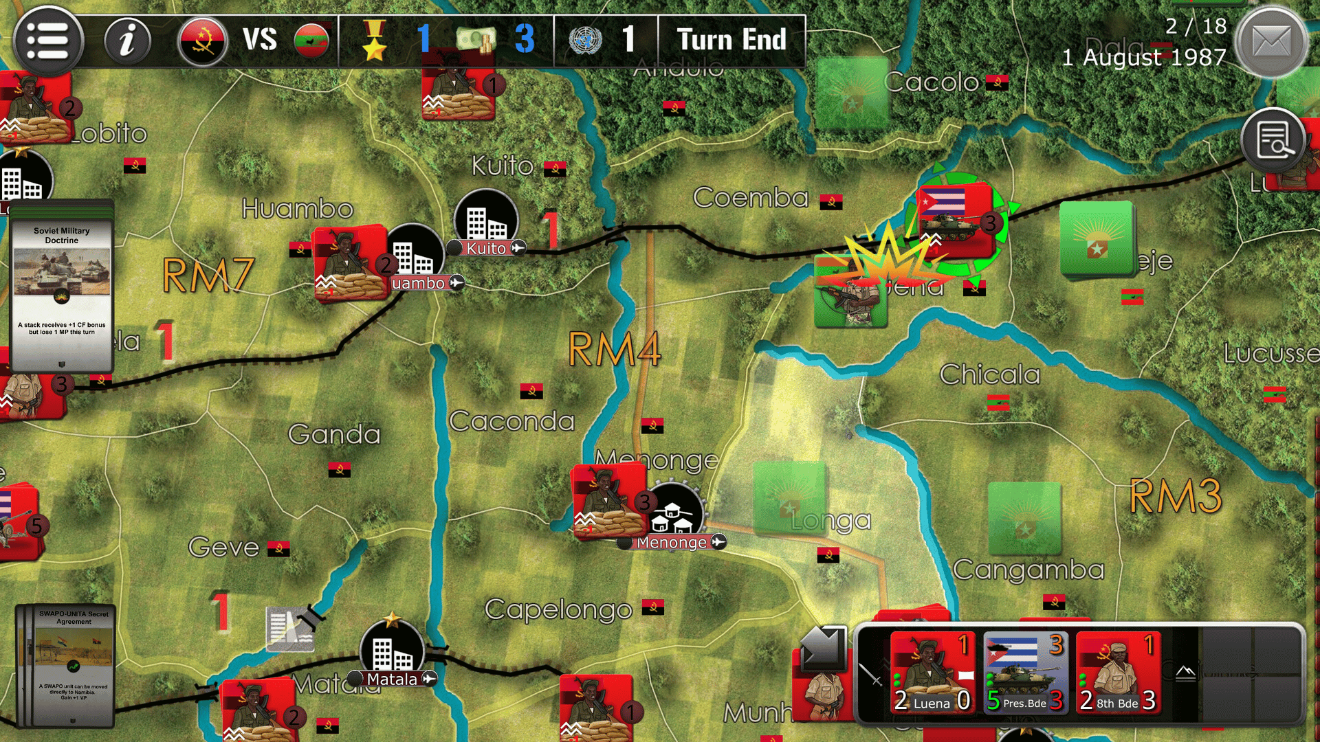 Angola 1988 covers the last year of the war in Angola. To win, both sides must either eradicate the enemy from the filed, or take control of all cities and keu location. Otherwise, Peace negotiations will end the game and victory will come to the one ahead in VP.