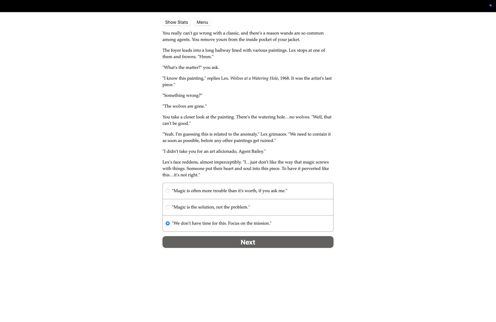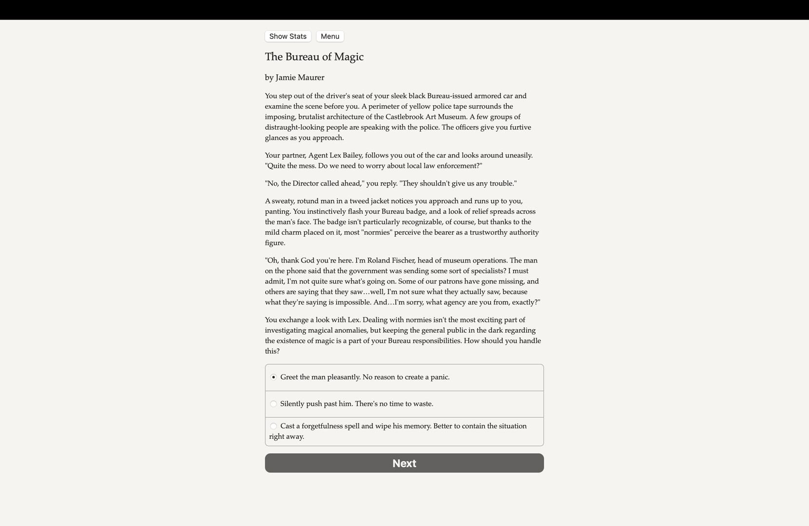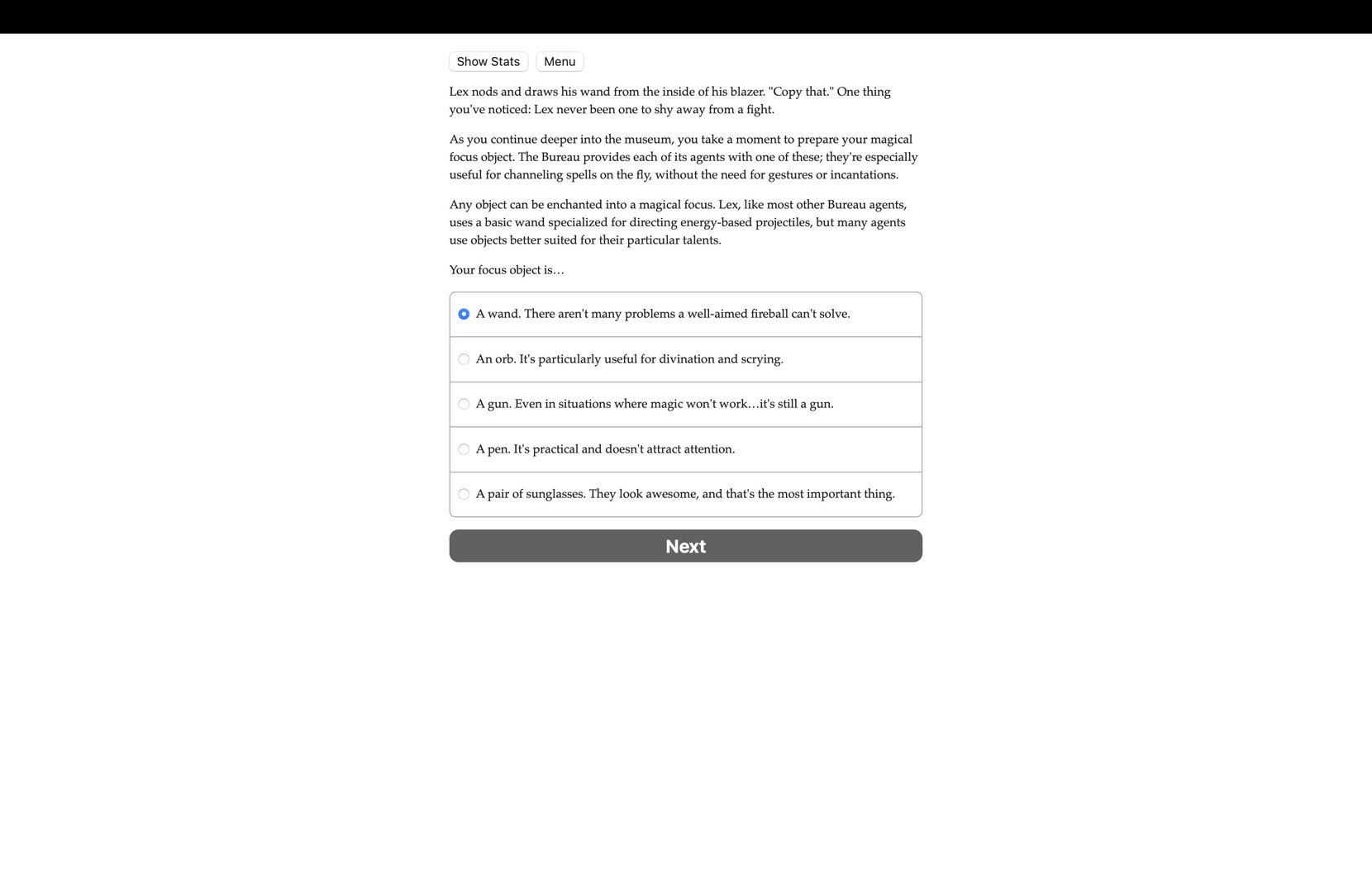 Recover a stolen artifact and lose your heart as a secret magical agent! Can you uncover an arcane conspiracy before the clock runs out? An interactive, text-based magical romance novel.