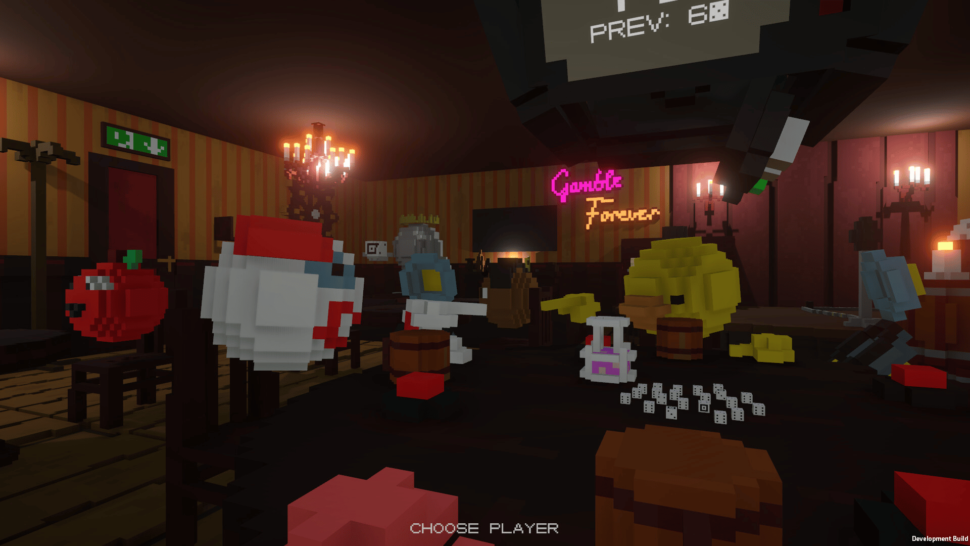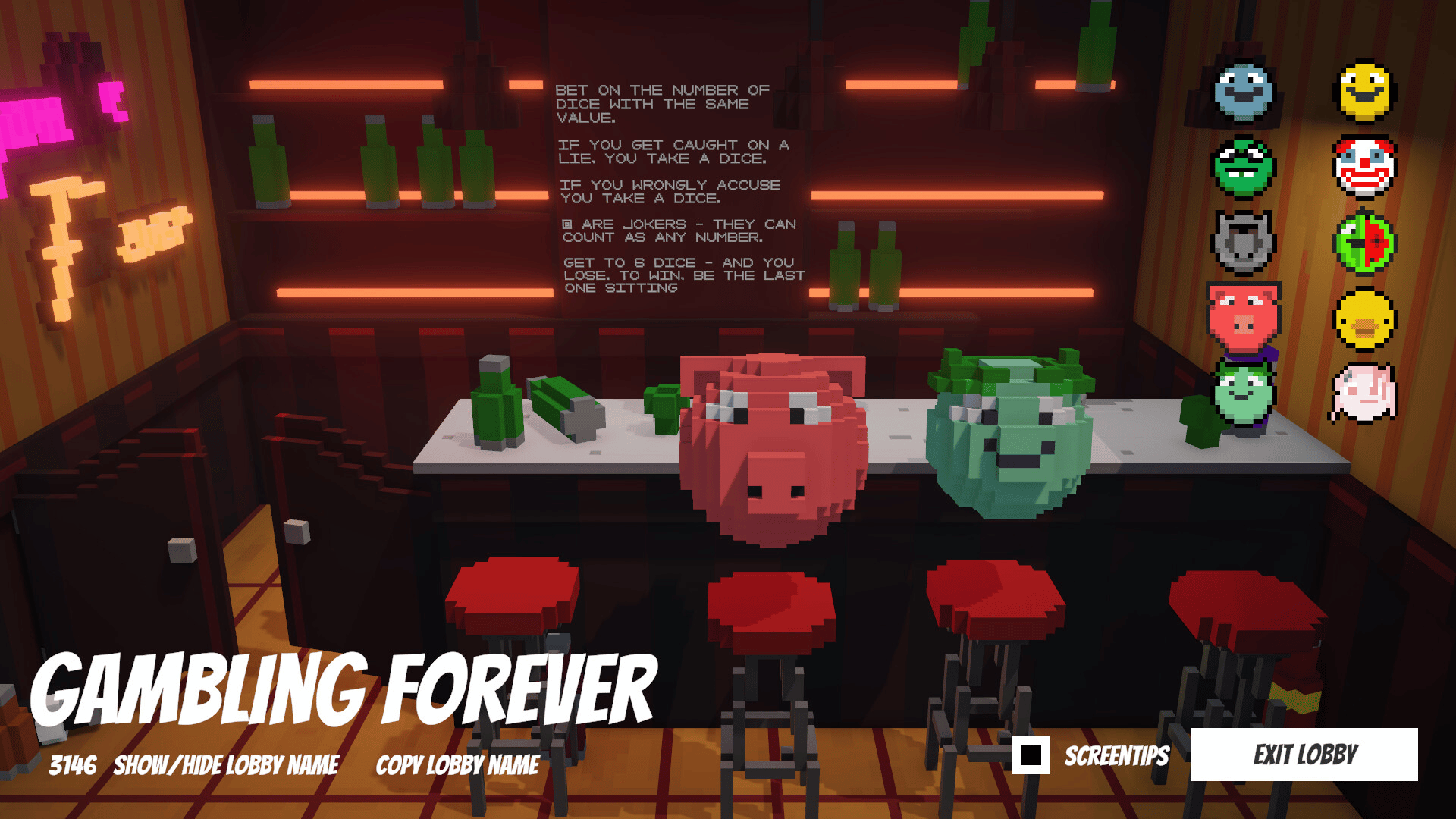Gamble with your friends in a game of dice! Bet on the total number of dice with a specific value on the table, while you can only see your dice. Using various items and magic dice, outluck your friends or figure out an impossible-to-lose strategy!