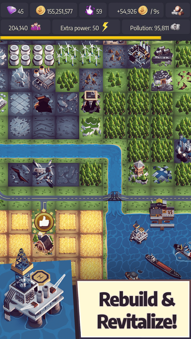 Enter the world of Post Apo Tycoon, where you will revive a post-apocalyptic fallout landscape after a nuclear explosion. Take on the challenge of exploring, building, and transforming the landscape back into a thriving ecosystem. Get out of your nuclear silo to fill in the grain silo and rebuild the world!