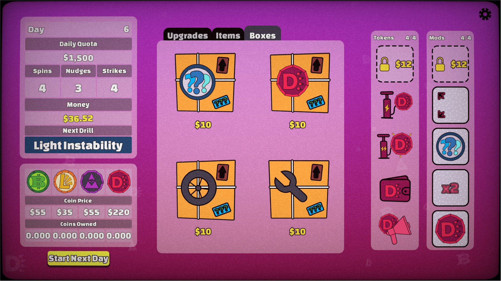 A rogue-like slot-machine builder about cryptocurrency and capitalism. Score lines and set off chain reactions to generate a fortune. Invest that fortune in upgrades (or back into coins) to amass an even bigger one! All the fun of casinos and day-trading without the risk of financial ruin!
