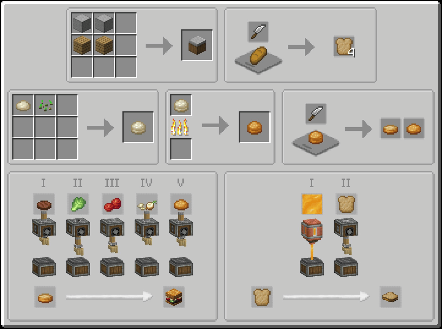 Some Assembly Required is a Farmer's Delight and Create add-on that allows players to create custom sandwiches. To get started, create some bread slices using Farmer's Delight's cutting board, or make a burger bun. Then, place down a Sandwiching Station, place a bread slice or bun on top, and start adding ingredients. In addition to food, potions can also be added. Once your sandwich is finished, you can pick it up by breaking it. Sandwiches can be placed down anywhere in your world by shift-right-clicking. A sandwich restores the same amount of hunger and saturation as it's ingredients. However, if it contains at least 2 unique ingredients (excluding bread and potions), it will additionally grant a Comfort buff if it's a sandwich, or a Nourishment buff if it's a burger. The length of this effect increases with the number of unique ingredients. If doing things automatically is more your style, you can automate the production of sandwiches using Create's deployers. Furthermore, spouts can add fluids such as potions, honey or chocolate to your sandwiches. A full list of compatible fluids can be found in JEI.
