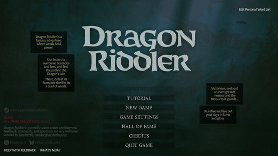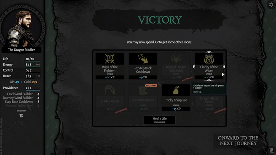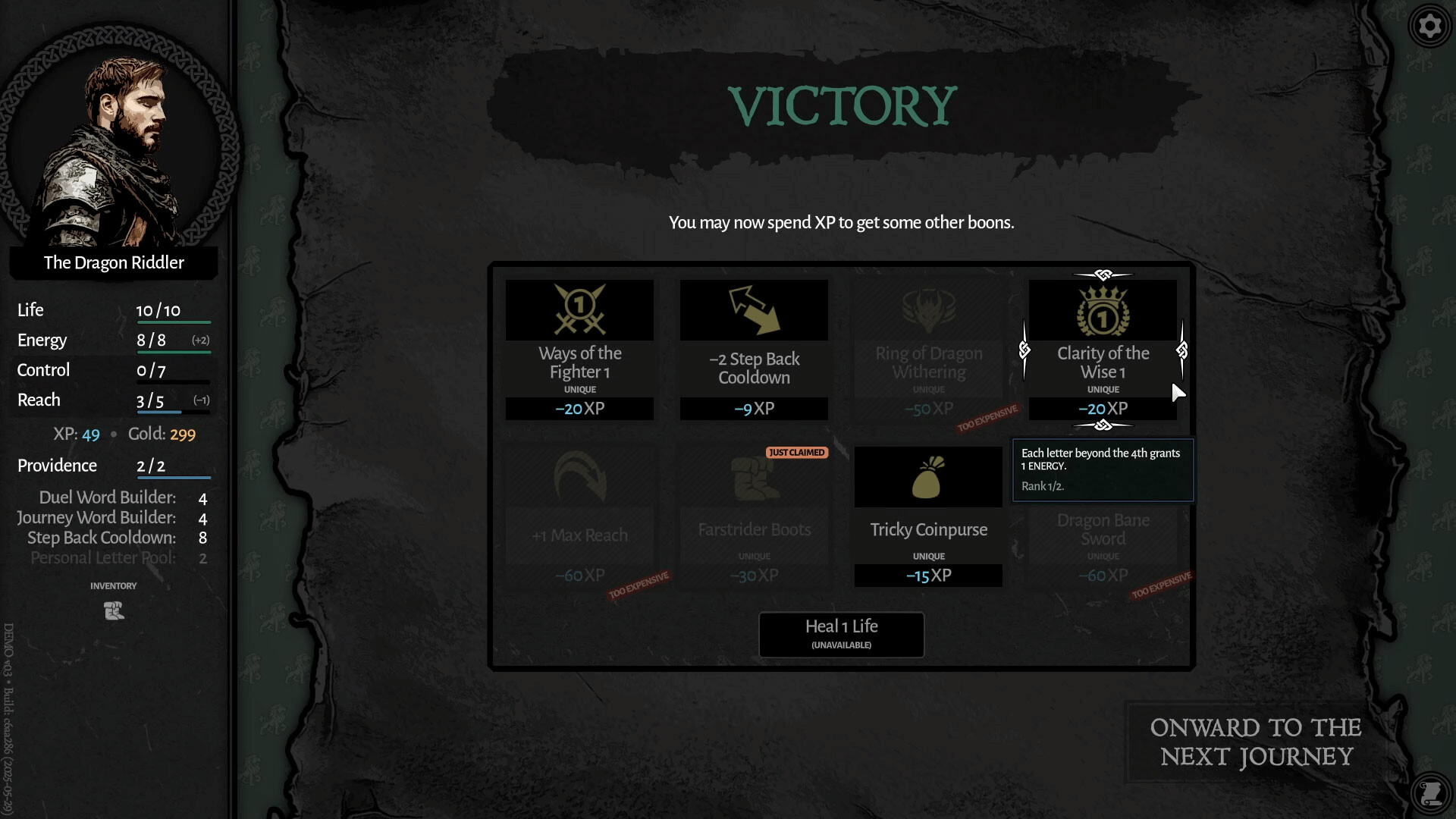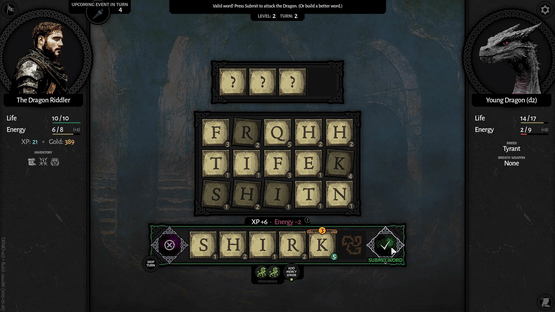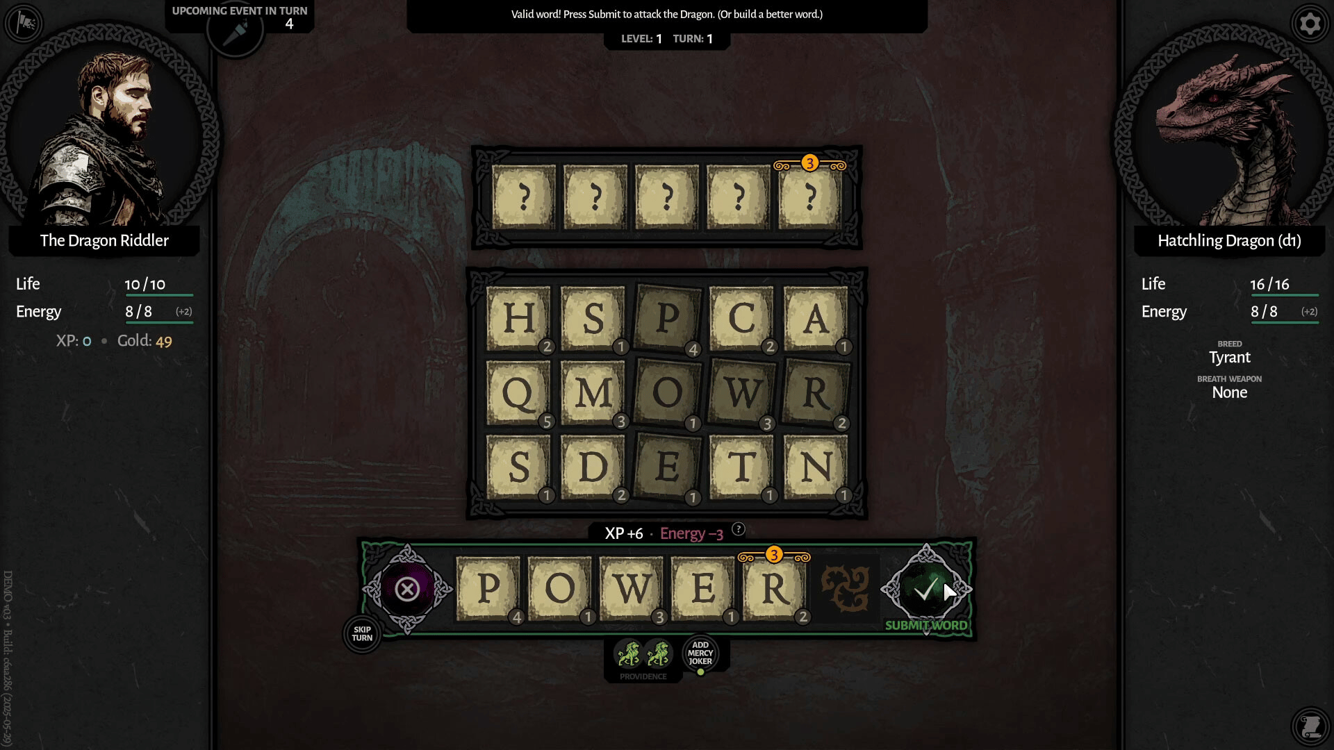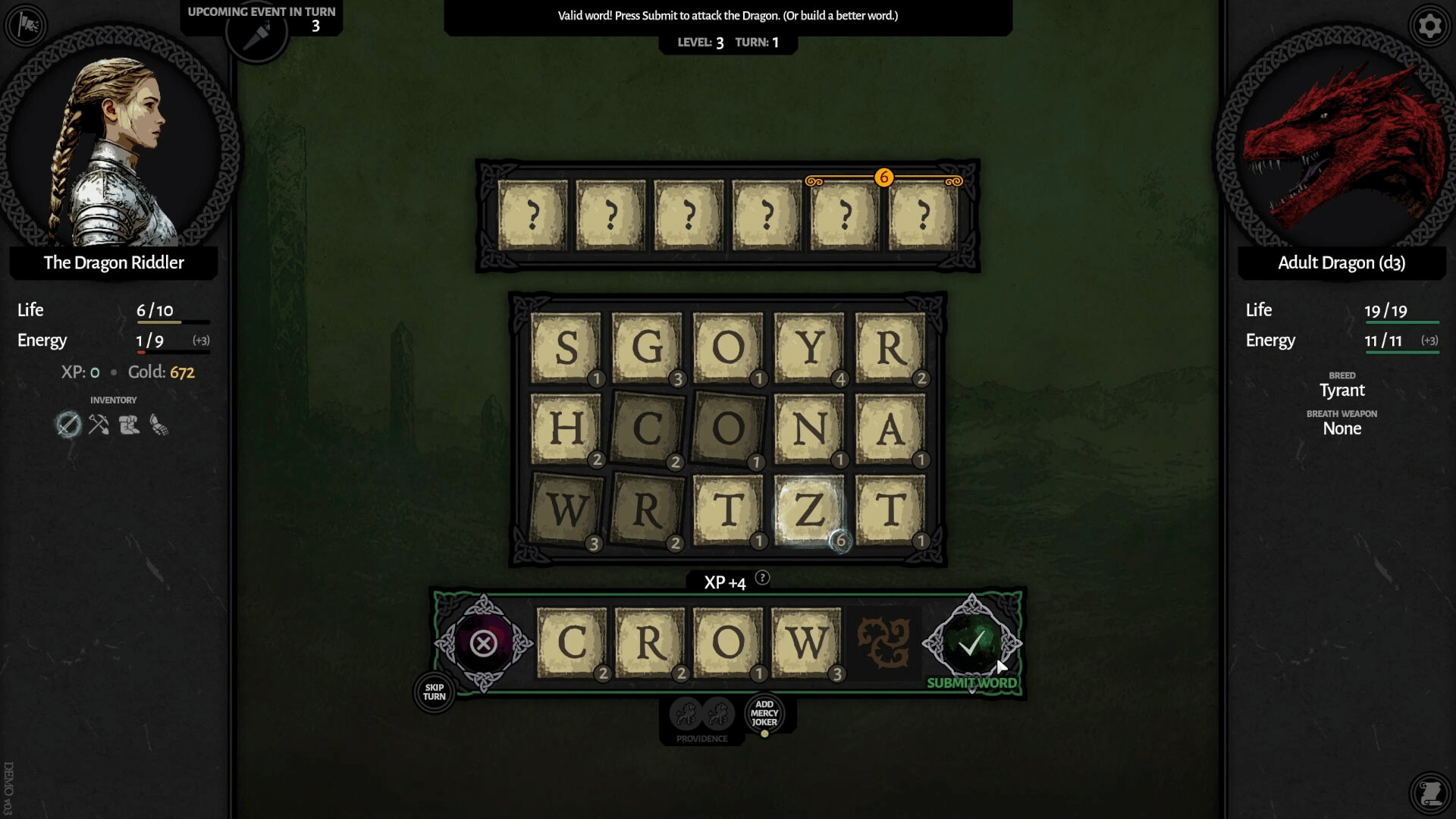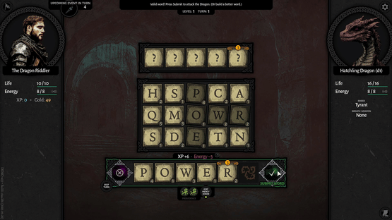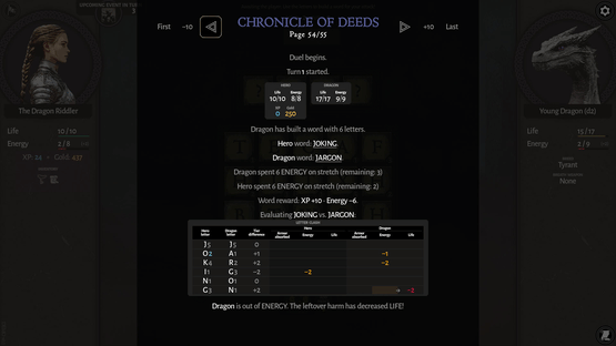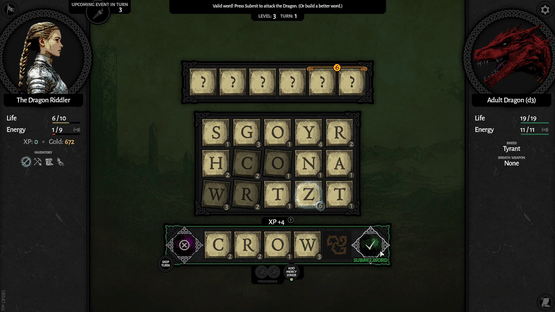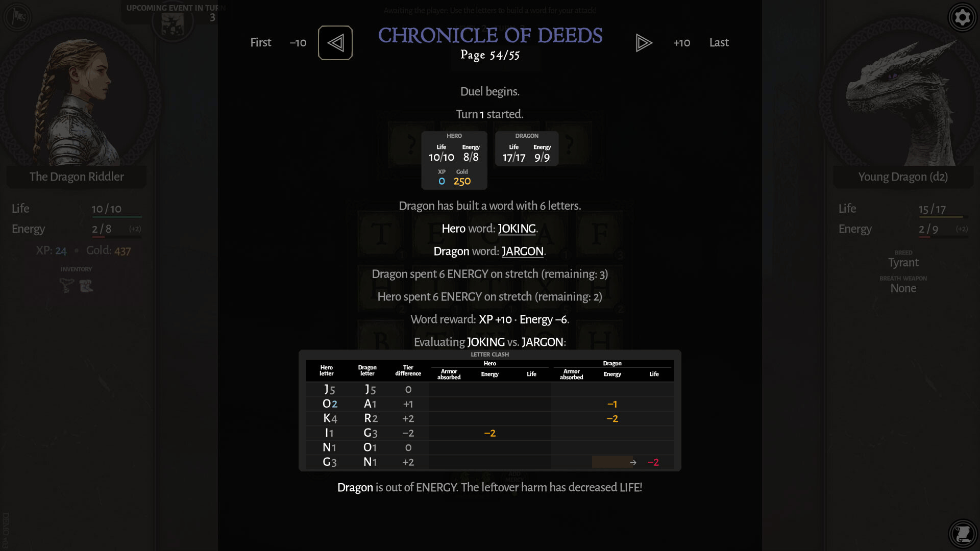A turn-based puzzle adventure with a simple concept: Find dragon's lair → defeat dragon → grab treasure → upgrade → next. But with words.