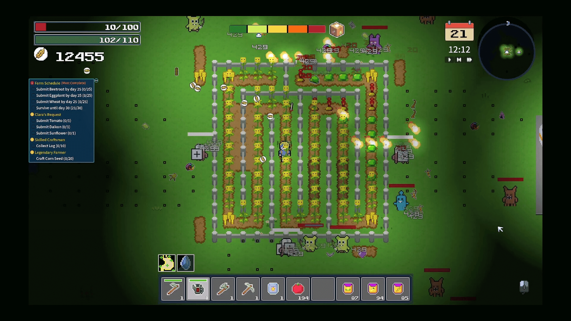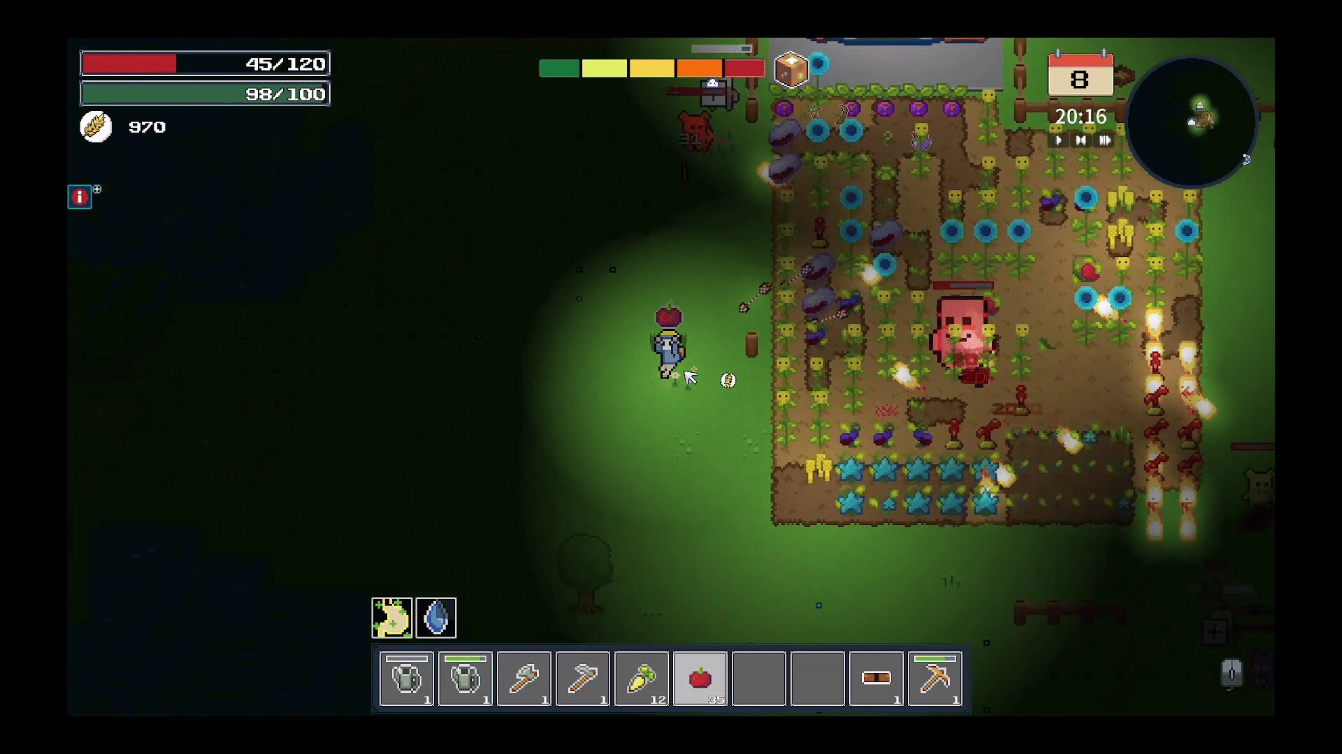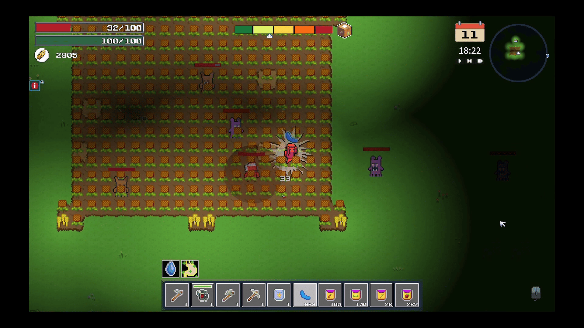 Gutfarm is a top-down 2D pixel art game that blends farming, tower defense, and survival elements. On this alien island, you will expand and grow your farm by planting crops, unlocking genetically mutated varieties, defending against waves of monster attacks, collecting relics, and more!
