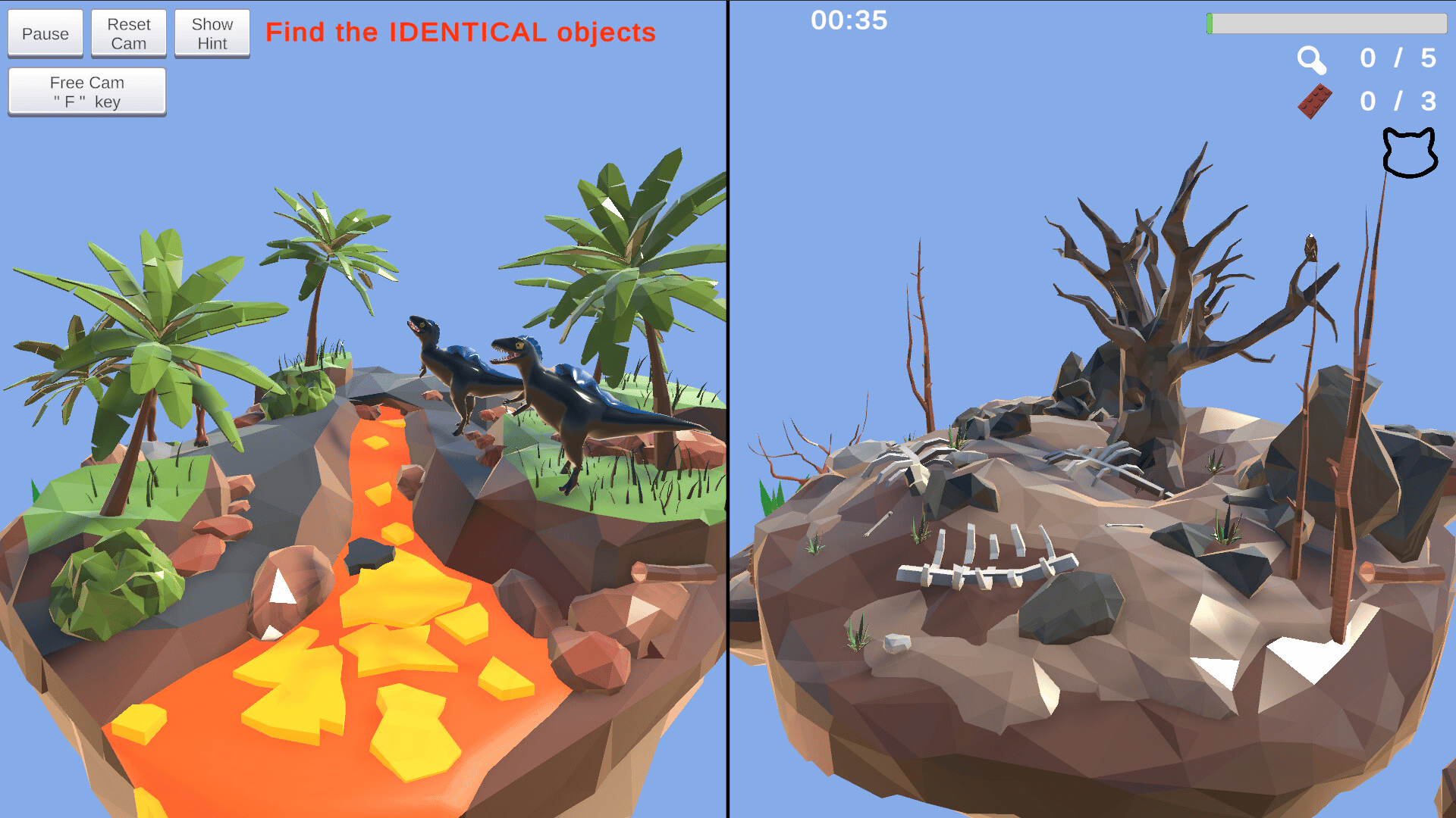 A game of finding differences in 3D environments. In 30+ levels with 6 different themes you can find: Hidden object, colour, size, rotation and location differences. Also Find the same objects in different environments. Control with the mouse and navigate with the free camera. Have fun!