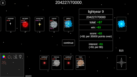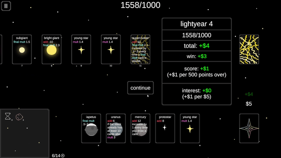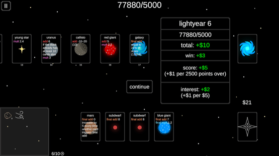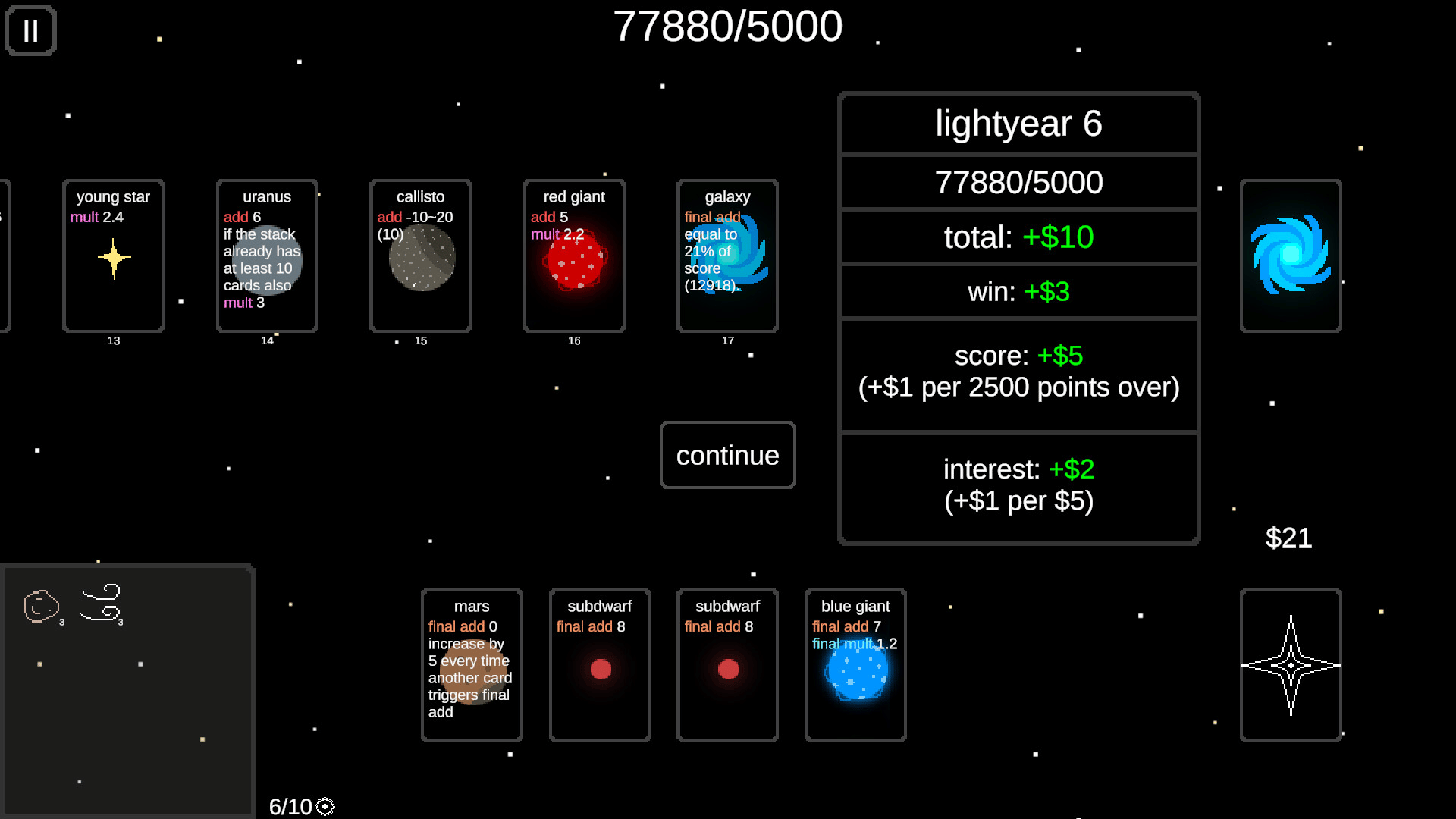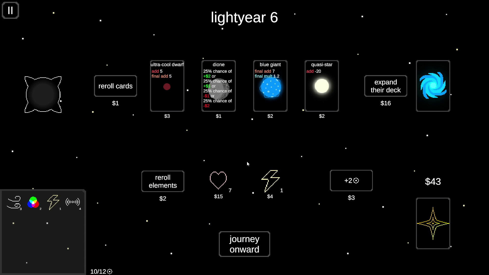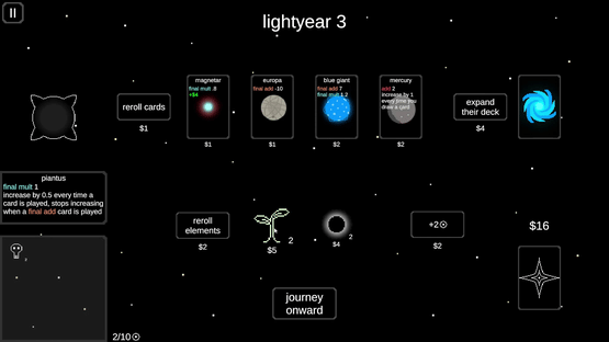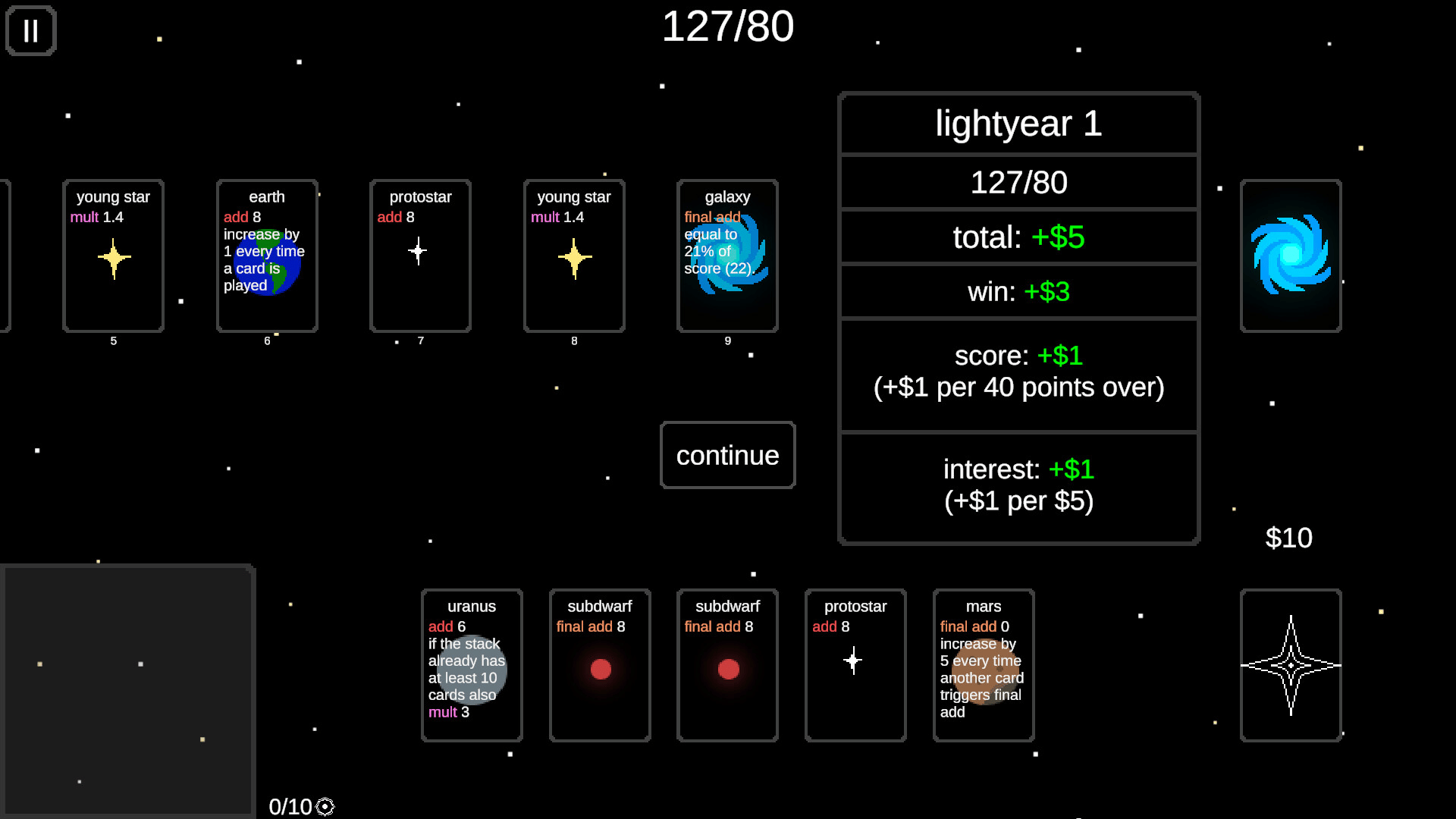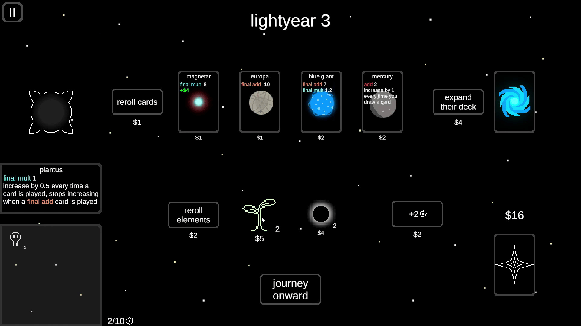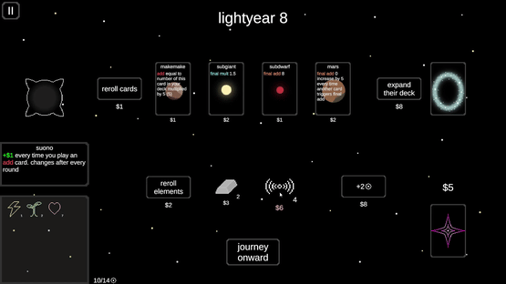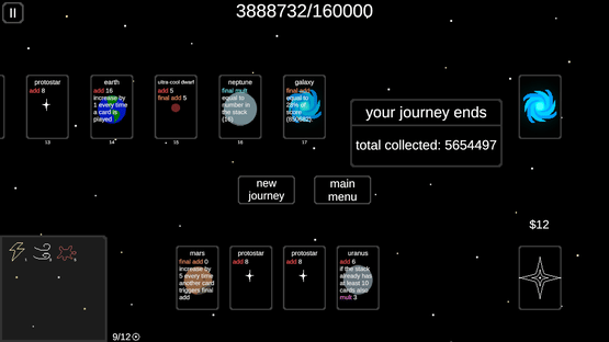 A deckbuilder roguelike where you journey through space. Use star, planet, and moon cards to raise your score and harness the power of elements to reach even further. Discover synergies and combos to reach scores that are out of this world.