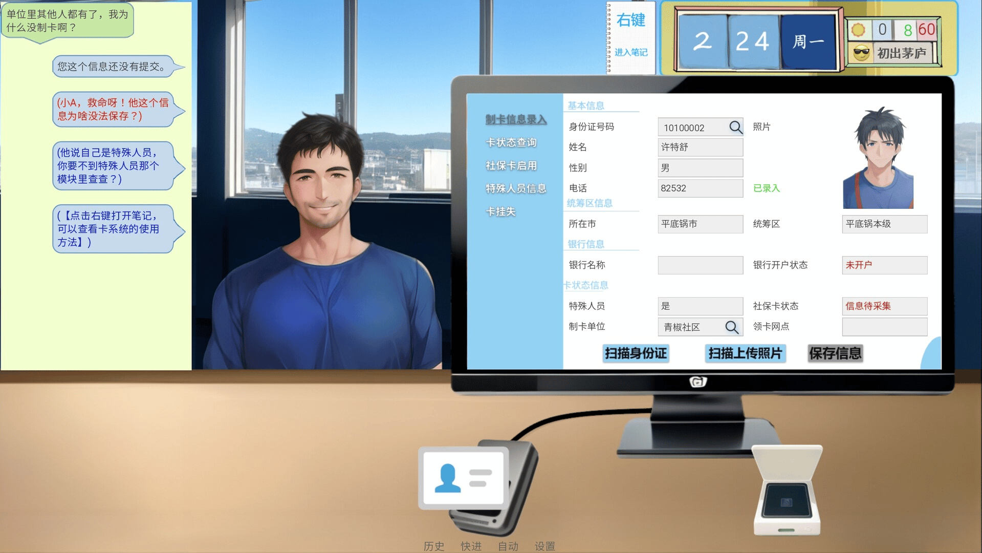 This text-based adventure simulates window service work.As consultant to heroine Xiao Qiao, players assist her social security card distribution tasks:Master card issuance proceduresExperience diverse human interactionsGuide Xiao Qiao in finding her life purpose