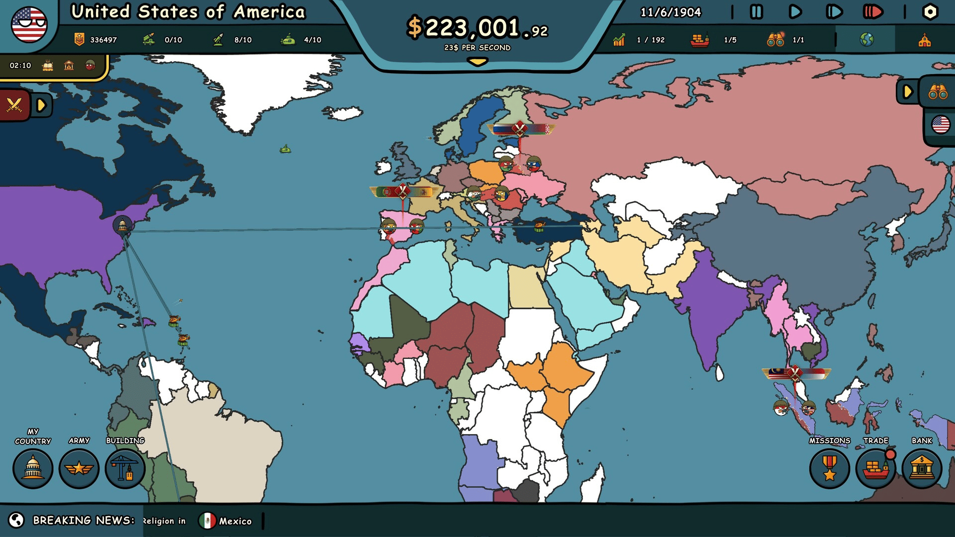 Incarne un Countryball et conquiers le monde – par la force, les accords ou les ruses. Développe ton économie, construis ton armée, fais-toi des alliés ou des ennemis, et règne sur les 195 pays. Une domination mondiale, plus ronde et plus drôle.