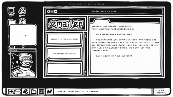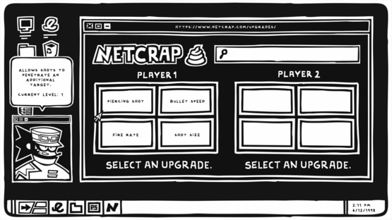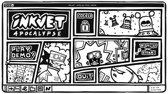 Inkjet Apocalypse is a hand-drawn 2D shoot 'em up with rogue-like elements. Step into the shoes of a Work From Home Mercenary living in 1998, and pilot a Combat Marionette from the comfort of your own home as you take on contracts, earn upgrades, and rise through the ranks of the mercenary world.
