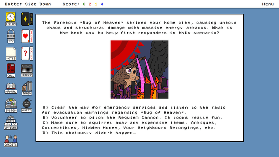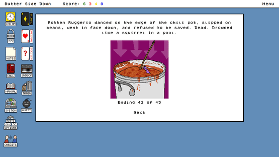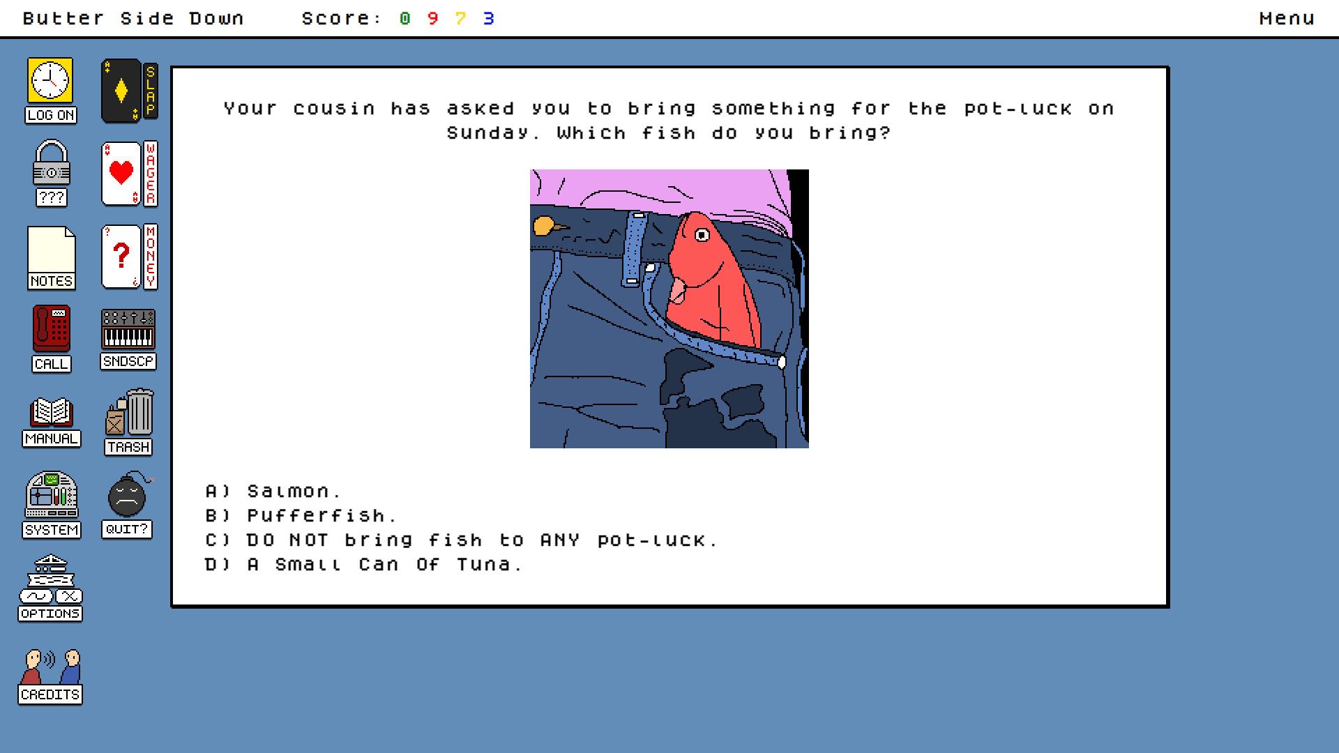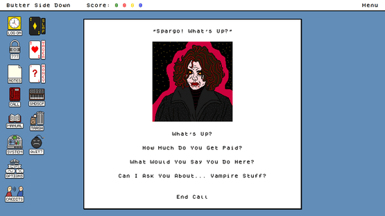 Butter Side Down is a bizarro choose-your-own-choice game. Starring Basil Bonser, Adam Spargo, Grey Michael, Beatrice, Jeep Johnson, and Rotten Ruggerio. Answer questions, take calls, play card games, and solve one hell of a mystery.
