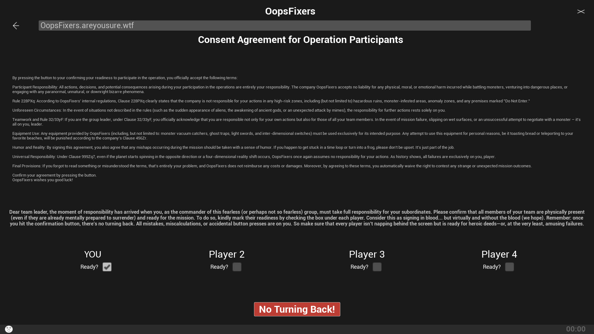 OopsFixers Company is a cooperative action game for up to 4 players where you work in a team to fix extreme situations that other companies avoid. Control unique characters. Collaborate with your teammates. Improve your team to be ready for the impossible.