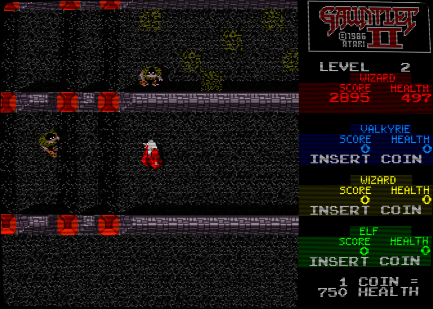The gameplay is very similar to the original Gauntlet, a topdown dungeon crawl supporting up to four players. The biggest difference from the original game is that players can choose identical classes, instead of being limited to a particular one for each joystick; each player is differentiated by color. Thus, instead of having a "warrior", "wizard", and "valkyrie" (for instance), in Gauntlet II there could be a "red wizard", a "blue elf" and a "green warrior". In addition to the new "class" system, new level designs were added, including the possibility of encountering them in altered ways by having the play-field turned in steps of 90°. Other new features included the enemy "It", which upon contact would make a player "It" and draw all enemies towards him/her. The only way to release this curse is by touching another player or entering the exit, turning any level containing "It" into a fantasy filled game of tag. Other notable additions include the ability to ricochet shots off walls by means of a special pick-up, acid puddles that caused large, predetermined amounts of damage and a large dragon which would occupy multiple squares and require multiple hits to destroy. New level elements were also added, adding more variety to the original game. These included "all walls are invisible", "magic walls" which changed into monsters or items when hit, "stun tiles" which stunned the player, and fake exits. Another challenge in the game is the possibility to find a "secret room". This can be found by completing specific achievements within the level (e.g., "don't be fooled", means that you must find the real exit first). The secret room contains items such as food and magic potions (extra shot power, extra shot speed, extra magic power, extra speed, extra armor and extra fight power). This sequel was also the first to feature what is now known as the Gauntlet theme tune, which resembles a simplified Baroque fugue.