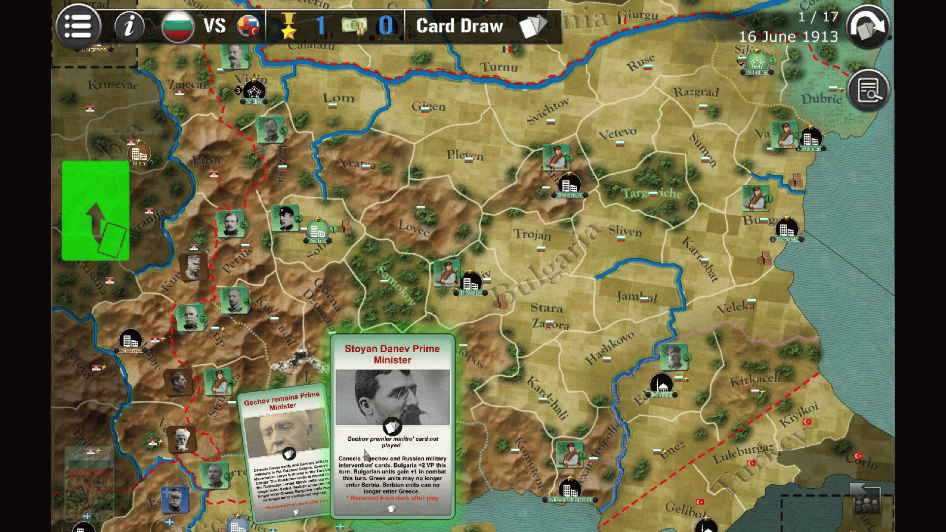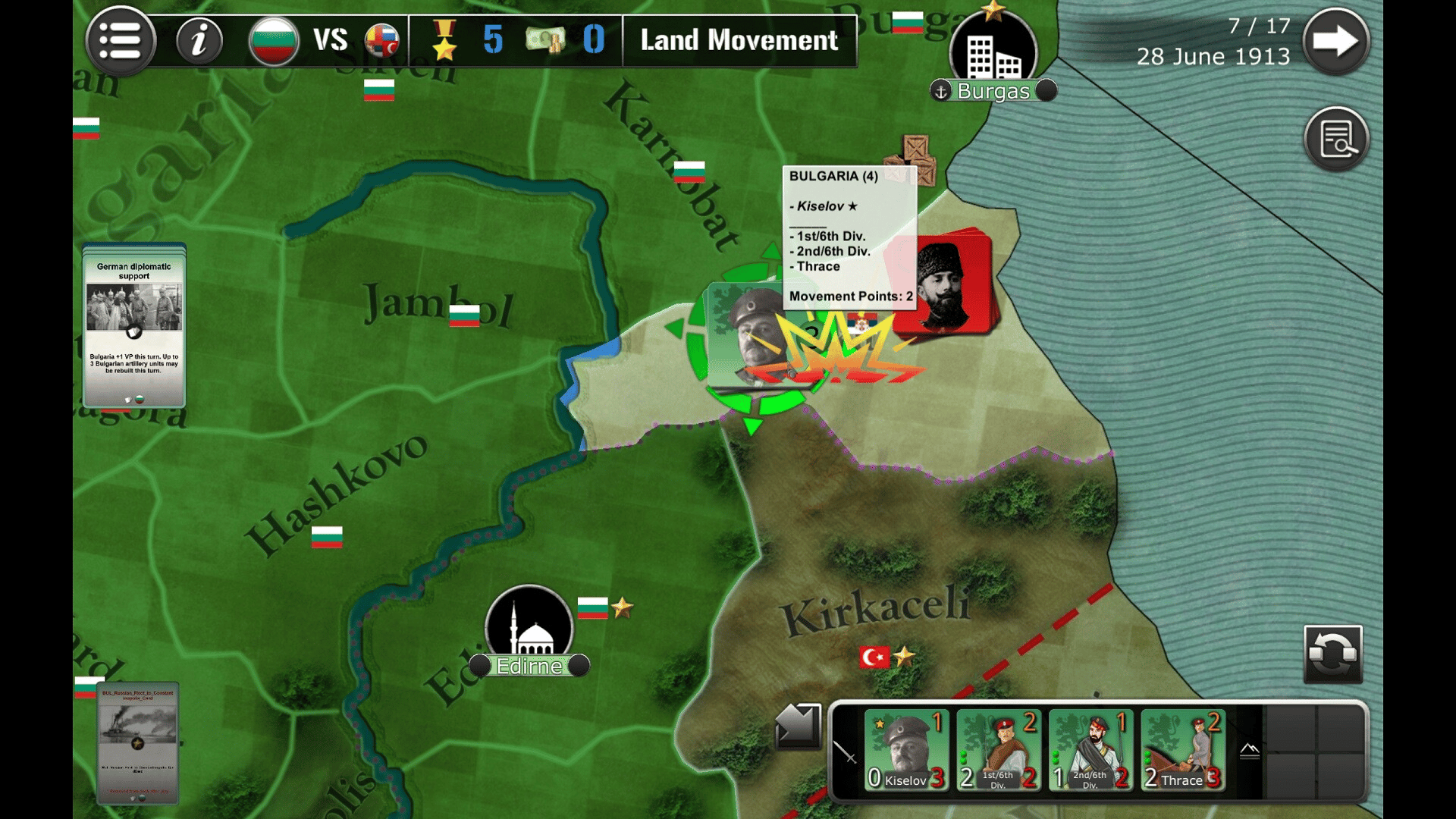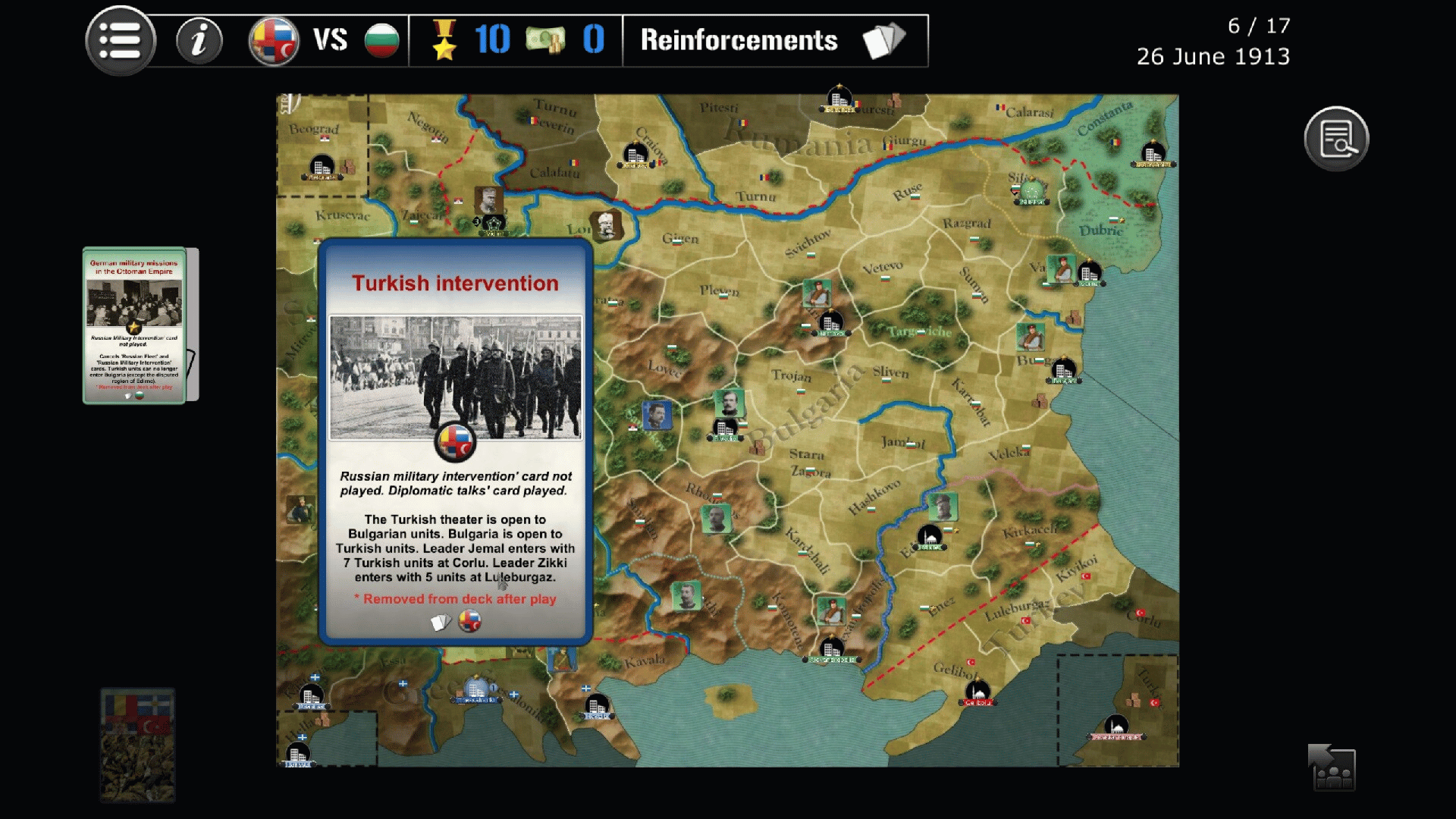 Bulgaria 1913 covers the second Balkan war, where the Kingdom of Bulgaria attacks by surprise its neighbors in order to preserve its conquests achieved in 1912, while its opponent has to repel the assault and try to win over the Romanians and Turks.