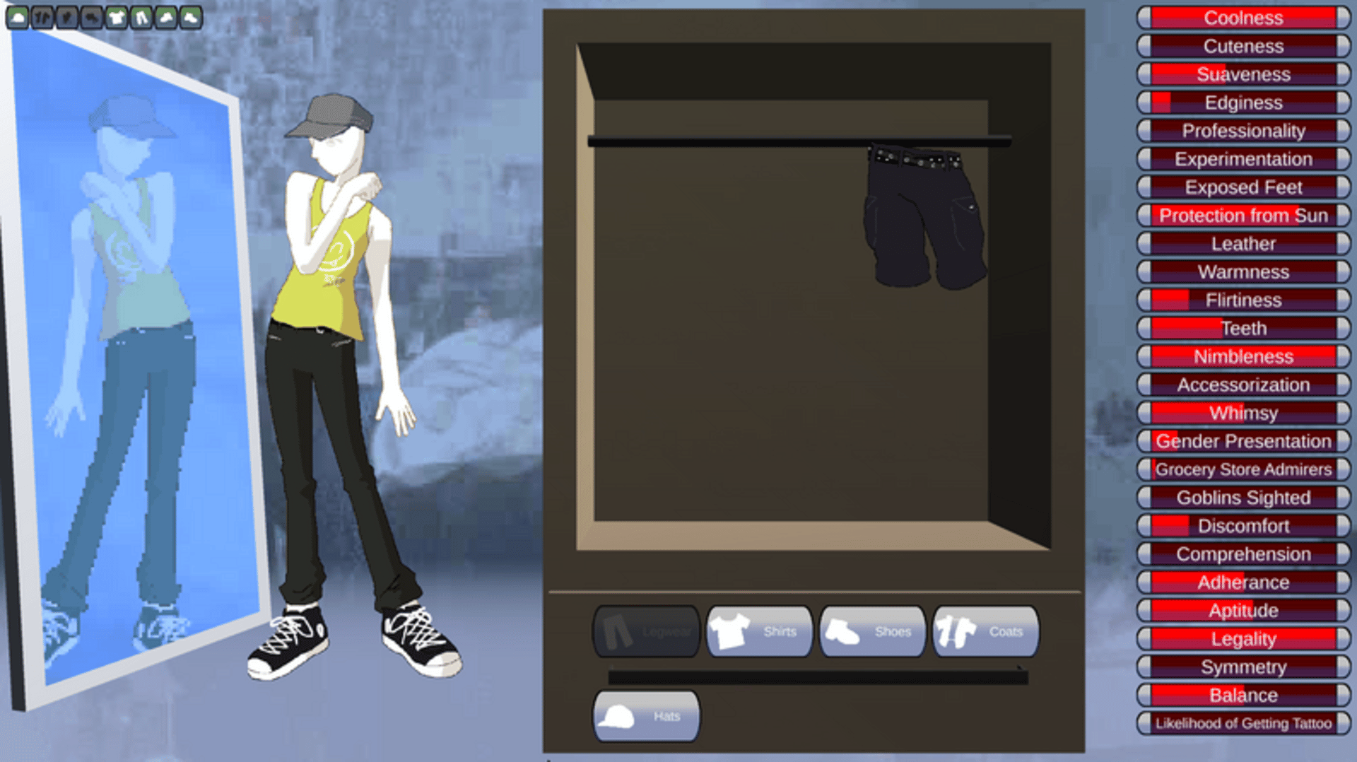 An anthology of three small "poetic" games and three small poems designed with the Formalist notion of "enstrangement" or "defamiliarization" in mind. "Prescription" explores alienation in day-to-day life, routines, and the taking of prescription medication. "Find the Main Character" explores alienation toward the people around you and comments on solipsism. "Dressup" explores alienation towards one's self and the disconnect between internal world and outward expression.