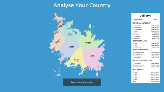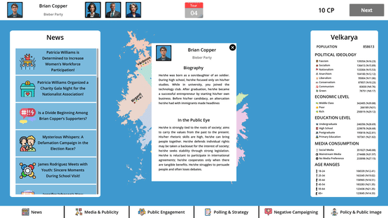 Votica is a election simulation game. Create your politician, run a strategic campaign, and win the votes of Velkarya's citizens. Every election is unique thanks to randomized demographics. With both single-player and multiplayer modes, it offers a humorous yet deep political experience.