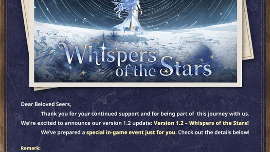 Version 1.2 - Whispers of the Stars has been released, which includes: • New extra story: Eons Reverberations • New characters: Phaenomena, Ariadne • New weapons: Stellar Wedge, Shadows of Reverie • Special events in progress • ...and more!