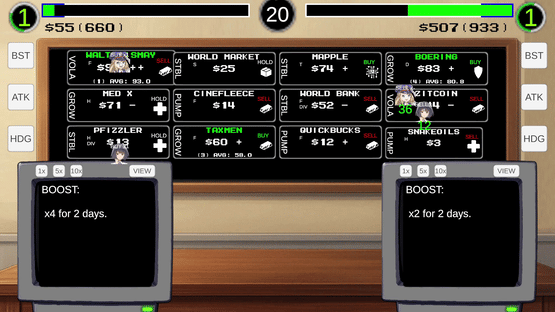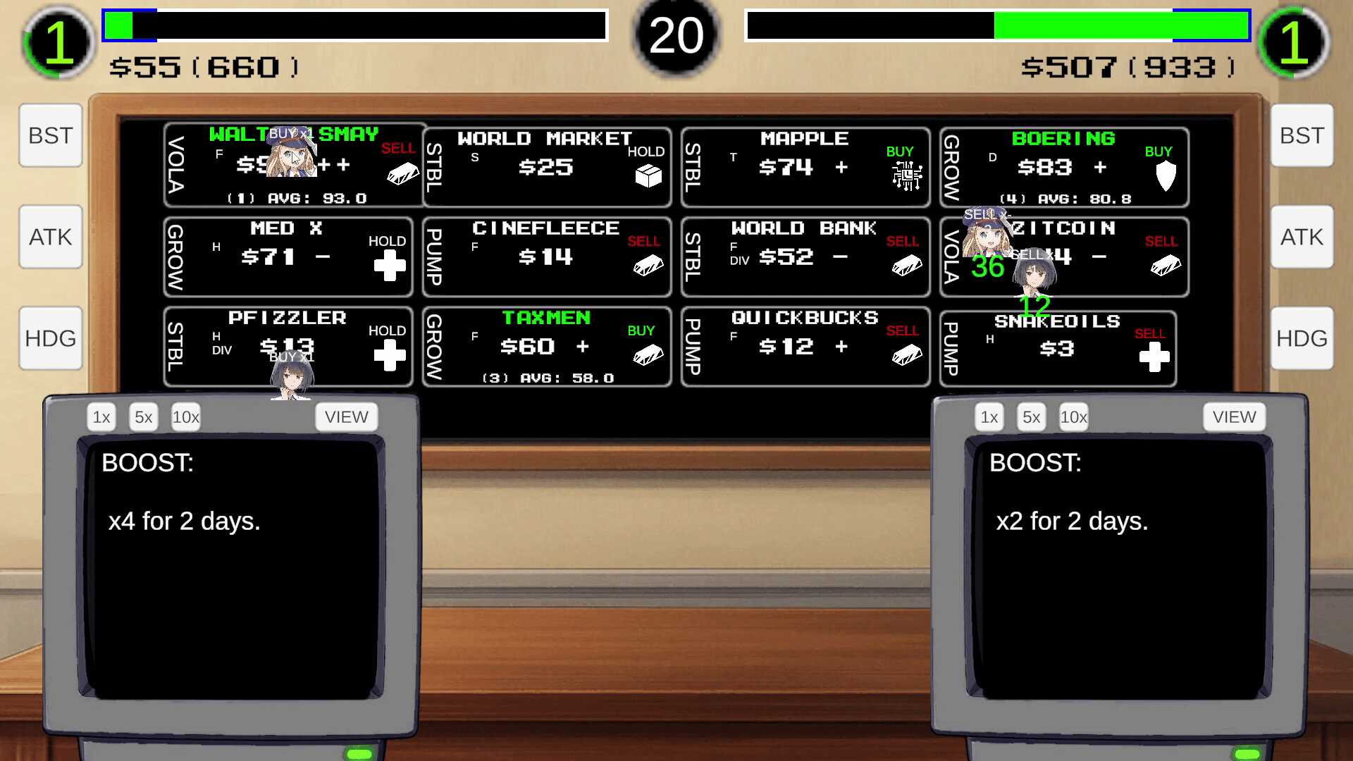 Wall Street meets street fighting! Engage in arcade-style trade duels where you buy low, sell high to drive your opponent into bankruptcy.