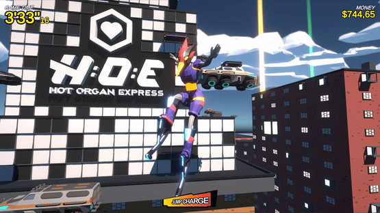 Hop Drop is a fast paced arcade game in 3rd Person. You're playing a Birdman on jumping stilts, delivering Organs in a futuristic city. Within a time-limit of 5 minutes you have to do as many deliveries as possible jumping from rooftop to rooftop or flying cars and any other object available.