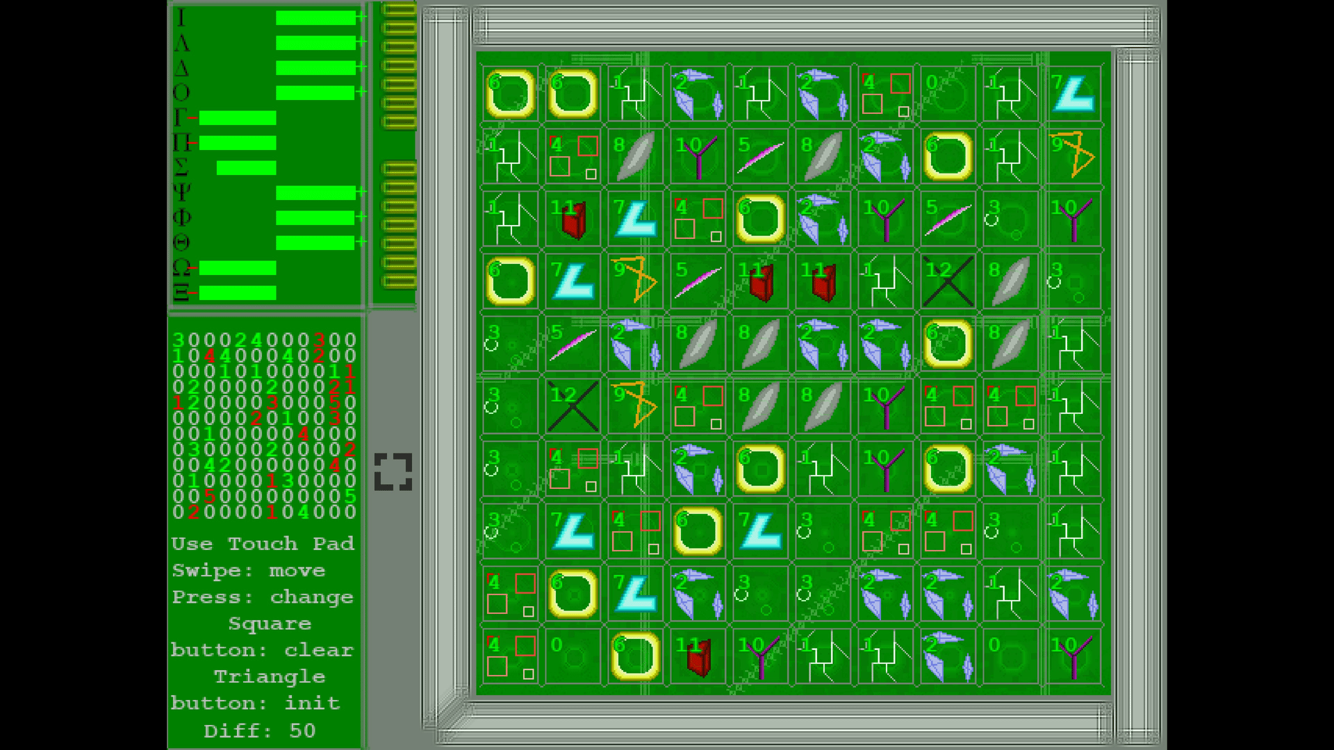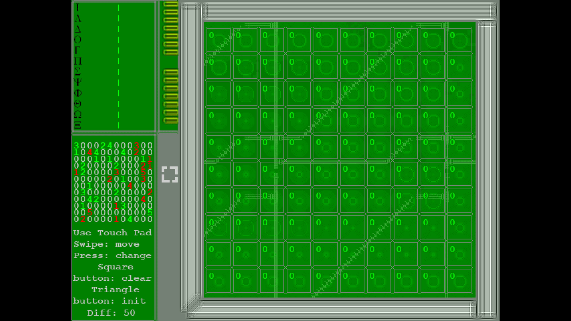 % is a puzzle game where you have to figure out how to get 12 gauges labeled with Greek letters filled to +100% and -100% respectively. This is done by changing the cells on the playing field in accordance to the distribution table which is generated in the start of the game.