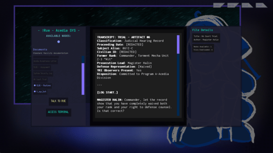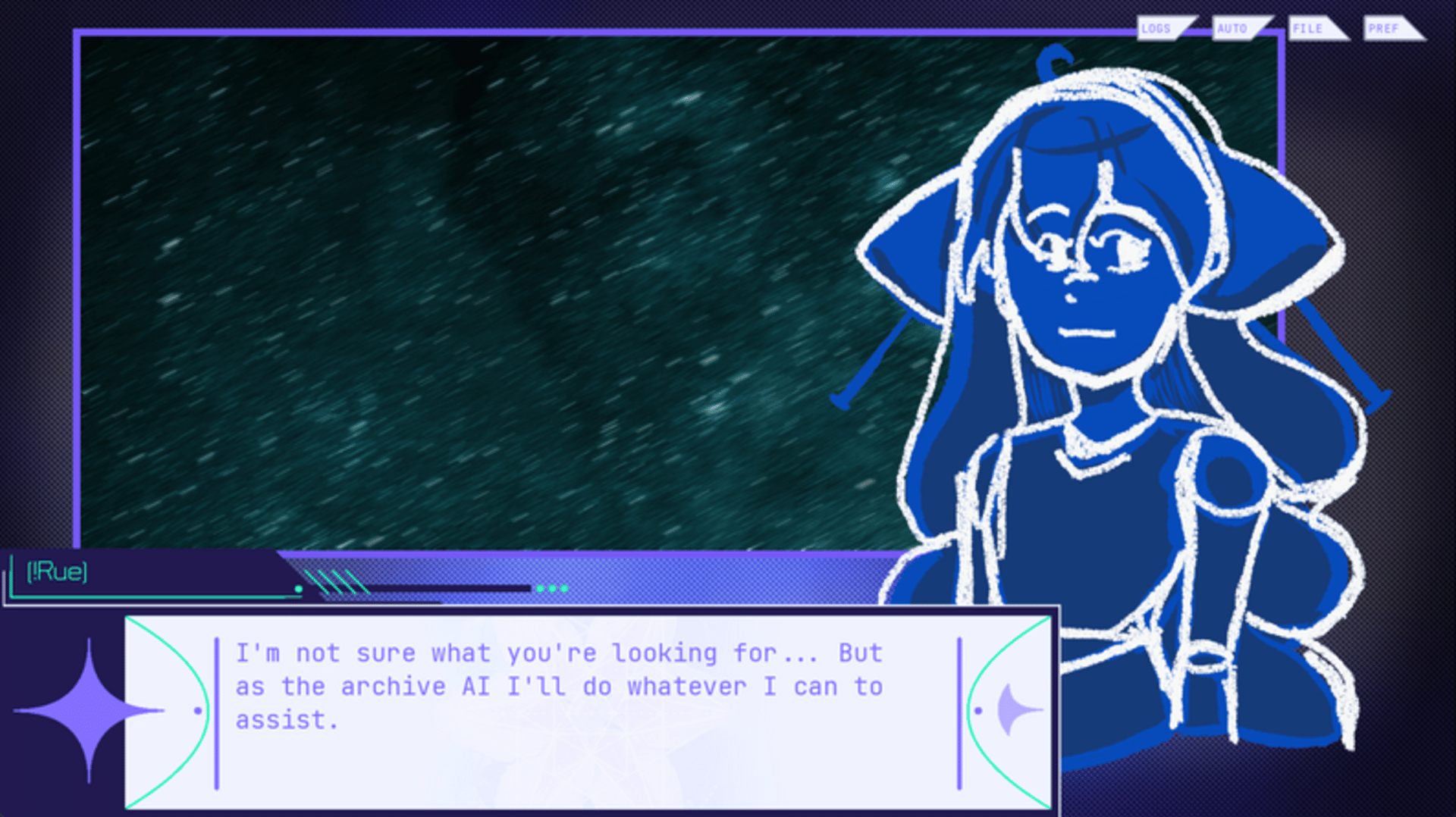 A sci-fi psychological-horror sound novel. Wake up the old system AI, !Rue, and have her unlock the archive logs. Find out what happened to our subjects of interest; girl named Kui and her companion, designation C-06.