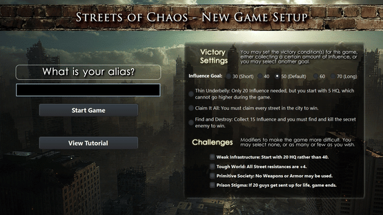 Streets of Chaos is a unique strategy/board game where you become the leader of a resistance in an apocalyptic world. Features a randomly generated world each game, high-res graphics and original music, and an open-ended strategy model that evolves and encourages thought and planning.