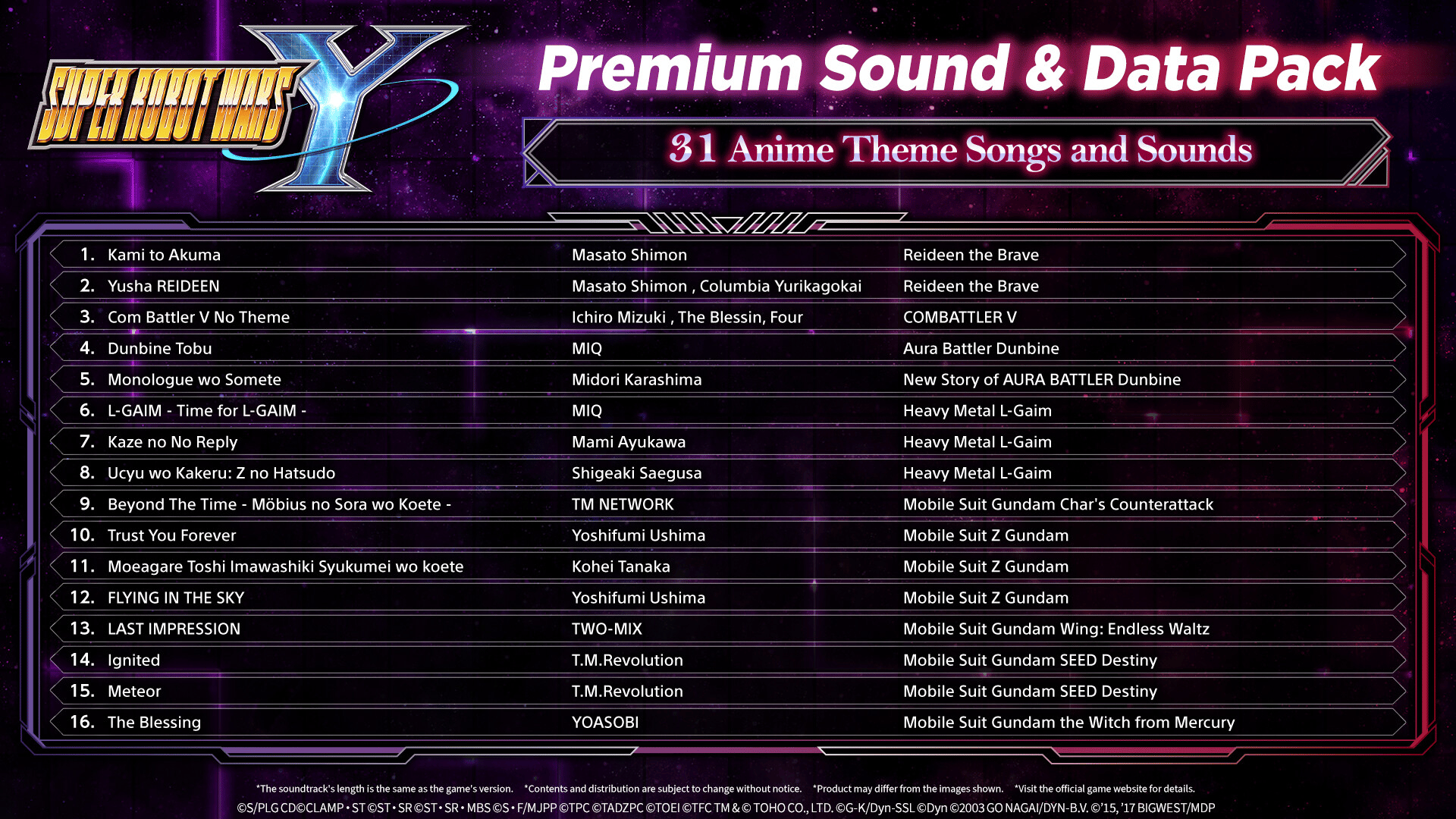 The Premium Sound & Data Pack includes the following content: 31 anime theme songs and sounds, 15 original music tracks, 55 pages of reference documents, including art and design documents, and 1 Bonus Mission.