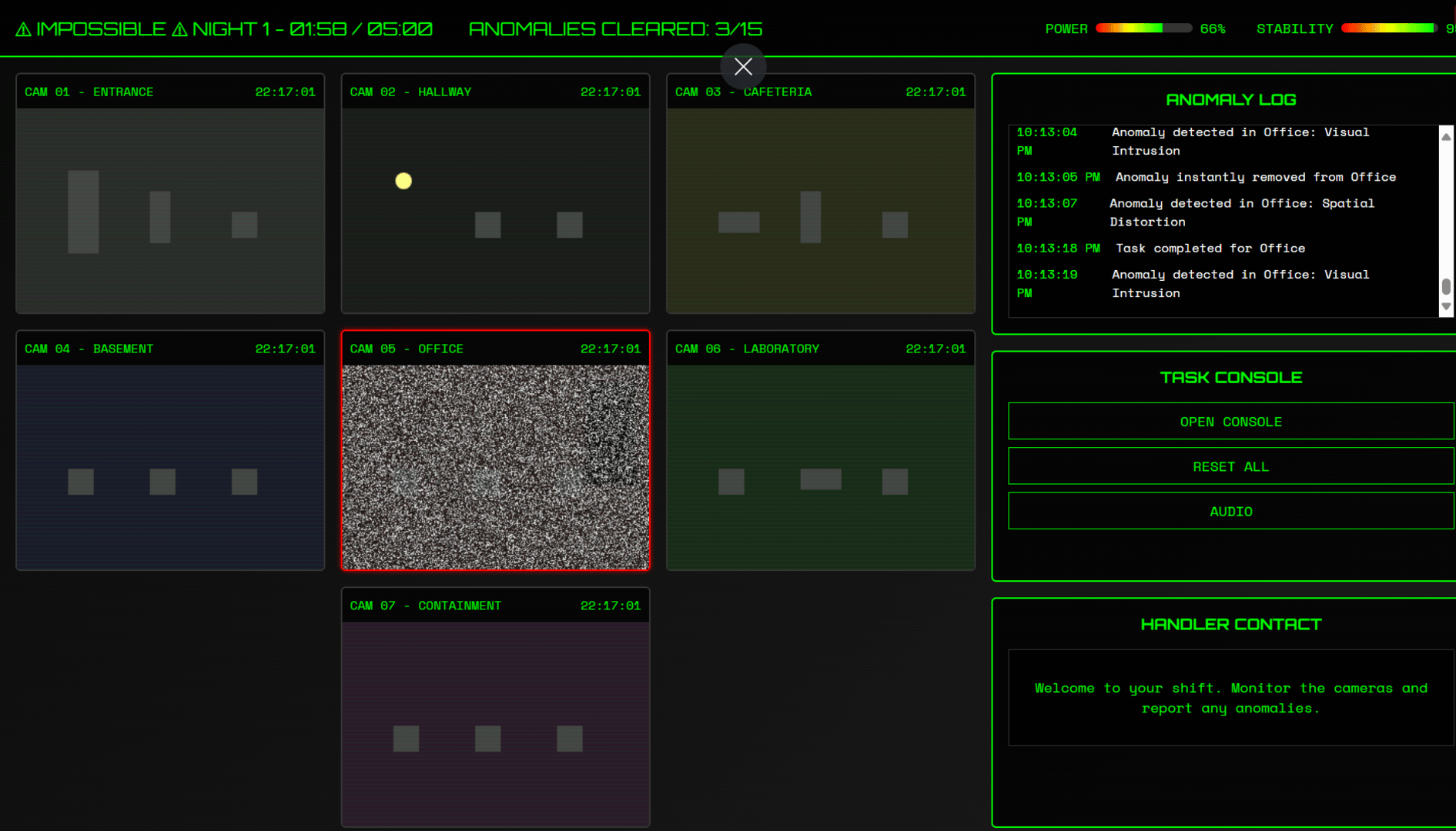 A Point and click style anomaly game where you have to click on screen and do different tasks to get rid of anomalies from the security room or else they will invade and take over
