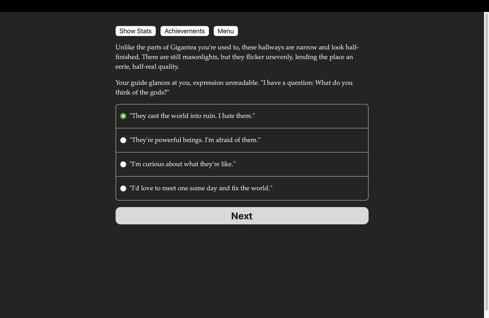The King lies. Your memories are a weapon. In humanity's last city, floating in a worldwide seascape, will you fight for truth or defend the crown? A 380,000-word text-based interactive post-apocalyptic science fantasy novel.